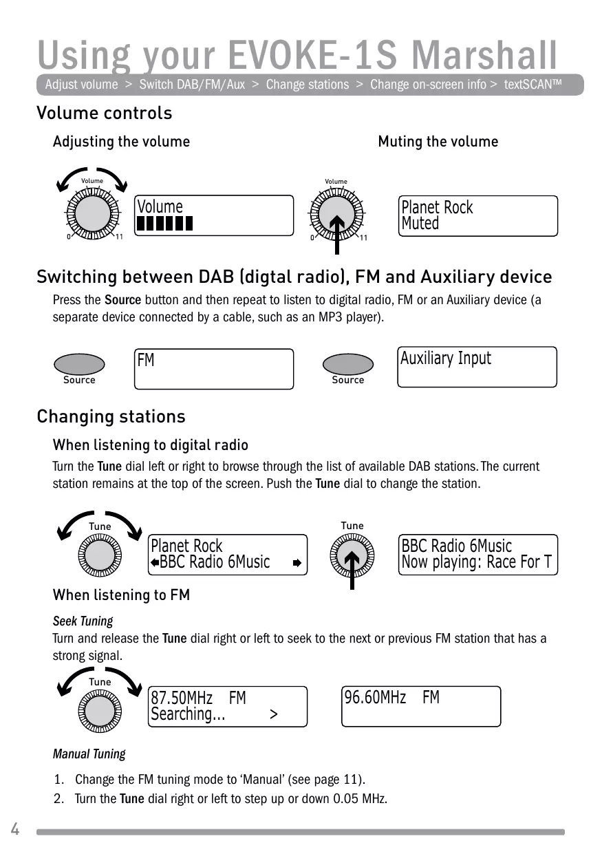 Volume controls 4 Switching between DAB (digtal radio), FM and Auxiliary device 4 Changing stations 4 Changing the information shown on screen 5 Using textSCAN ™ to pause and control scrolling text 5