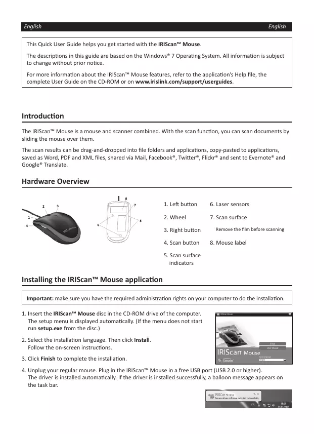 The descriptions in this guide are based on the Windows® 7 Operating System. All information is subject to change without prior notice. For more information about the IRIScan™ Mouse features, refer to the application’s Help file, the complete User Guide on the CD-ROM or on www.irislink.com/support/userguides.