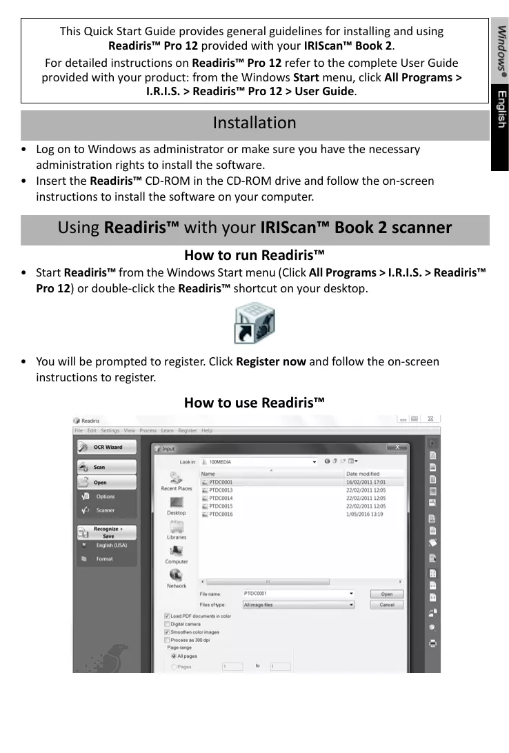 This Quick Start Guide provides general guidelines for installing and using Readiris™ Pro 12 provided with your IRIScan™ Book 2. For detailed instructions on Readiris™ Pro 12 refer to the complete User Guide provided with your product: from the Windows Start menu, click All Programs > I.R.I.S. > Readiris™ Pro 12 > User Guide.