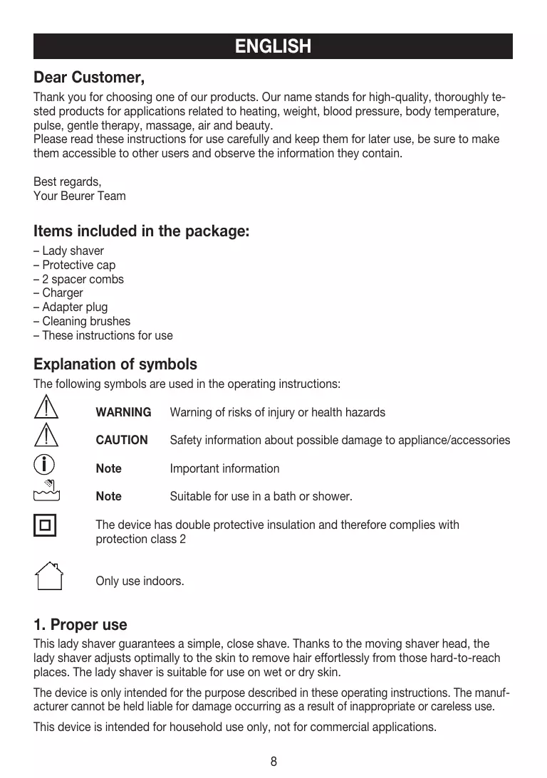english Dear Customer, Thank you for choosing one of our products. Our name stands for high-quality, thoroughly tested products for applications related to heating, weight, blood pressure, body temperature, pulse, gentle therapy, massage, air and beauty. Please read these instructions for use carefully and keep them for later use, be sure to make them accessible to other users and observe the information they contain. Best regards, Your Beurer Team