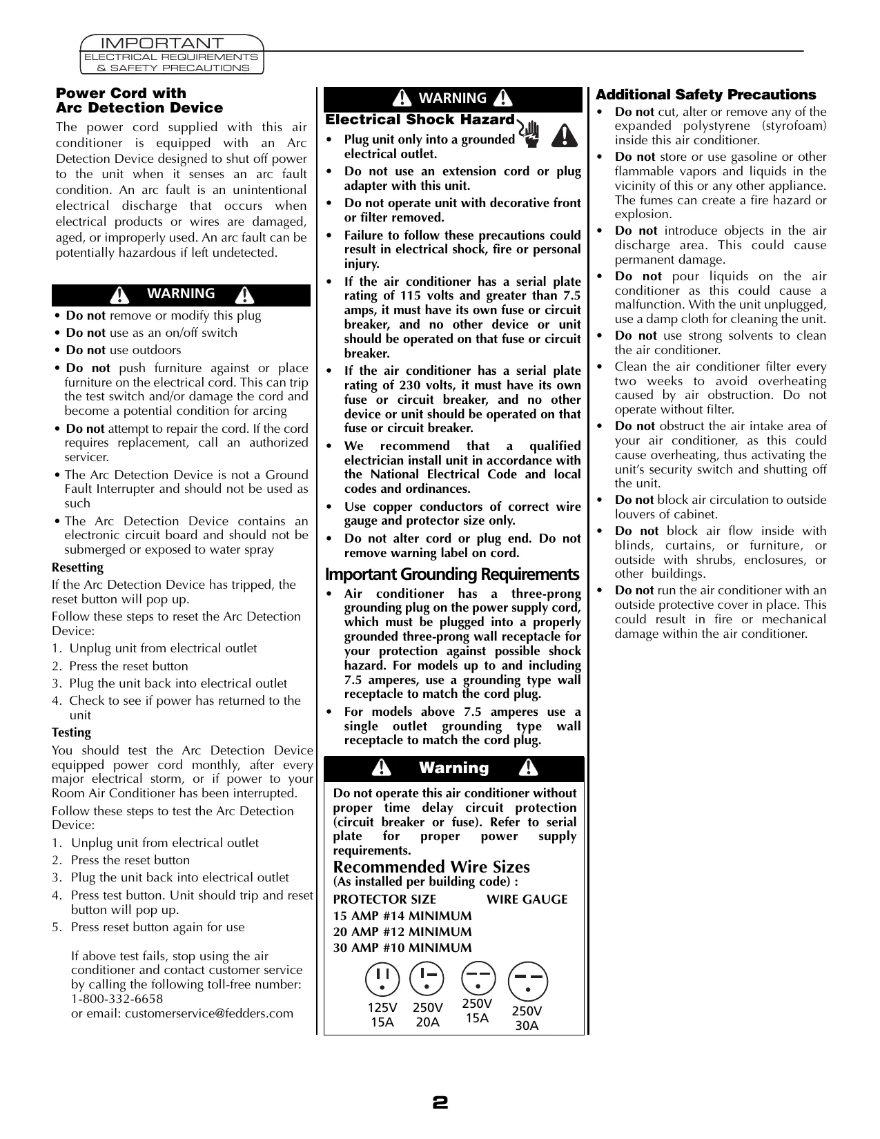 The power cord supplied with this air conditioner is equipped with an Arc Detection Device designed to shut off power to the unit when it senses an arc fault condition. An arc fault is an unintentional electrical discharge that occurs when electrical products or wires are damaged, aged, or improperly used. An arc fault can be potentially hazardous if left undetected.