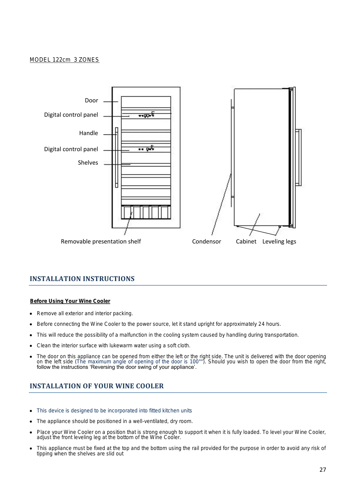 The Wine Cooler should be placed in a position where the ambient temperature is between 16 - 38^ / 60 100^ . If the ambient temperature is above or below this range, the performance of the unit may be affected. For example, placing your unit in extreme cold or hot conditions may cause interior temperatures to fluctuate. The range of 5 - 22^ / 40 - 72^ may not be reached.