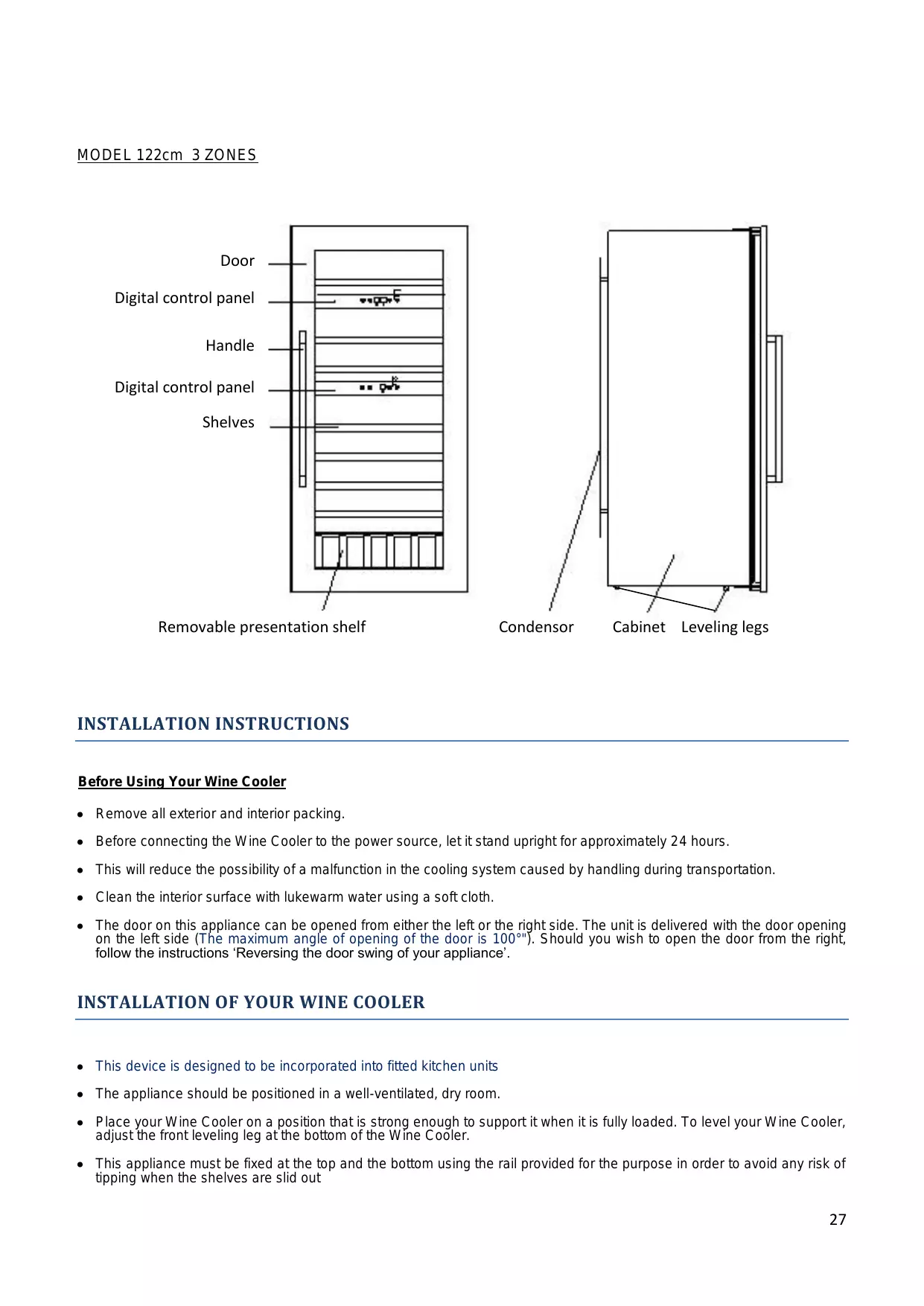 The Wine cooler should be placed in a position where the ambient temperature is between 16 - 38^ / 60 100^ . If the ambient temperature is above or below this range, the performance of the unit may be affected. For example, placing your unit in extreme cold or hot conditions may cause interior temperatures to fluctuate. The range of 5 - 22^ / 40 - 72^ may not be reached.