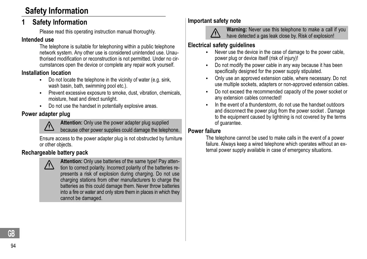 Warning: Never use this telephone to make a call if you have detected a gas leak close by. Risk of explosion!