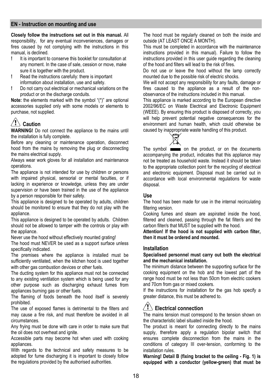 This must be completed in accordance with the maintenance instructions provided in this manual). Failure to follow the instructions provided in this user guide regarding the cleaning of the hood and filters will lead to the risk of fires.
