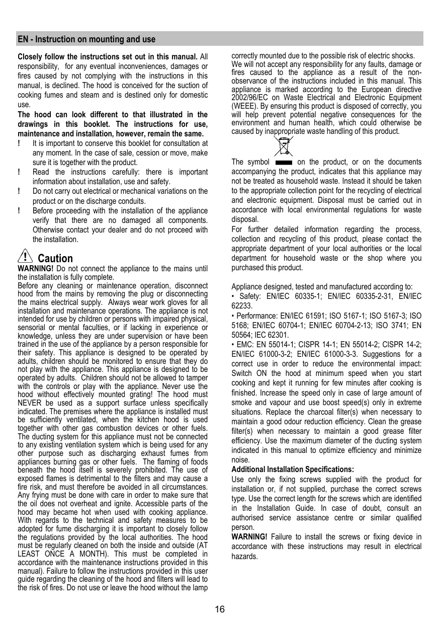 EN - Instruction on mounting and use correctly mounted due to the possible risk of electric shocks. We will not accept any responsibility for any faults, damage or fires caused to the appliance as a result of the nonobservance of the instructions included in this manual. This appliance is marked according to the European directive 2002/96/EC on Waste Electrical and Electronic Equipment (WEEE). By ensuring this product is disposed of correctly, you will help prevent potential negative consequences for the environment and human health, which could otherwise be caused by inappropriate waste handling of this product. Closely follow the instructions set out in this manual. All responsibility, for any eventual inconveniences, damages or fires caused by not complying with the instructions in this manual, is declined. The hood is conceived for the suction of cooking fumes and steam and is destined only for domestic use. The hood can look different to that illustrated in the drawings in this booklet. The instructions for use, maintenance and installation, however, remain the same. It is important to conserve this booklet for consultation at any moment. In the case of sale, cession or move, make sure it is together with the product. Read the instructions carefully: there is important information about installation, use and safety. Do not carry out electrical or mechanical variations on the product or on the discharge conduits. Before proceeding with the installation of the appliance verify that there are no damaged all components. Otherwise contact your dealer and do not proceed with the installation. on the product, or on the documents The symbol accompanying the product, indicates that this appliance may not be treated as household waste. Instead it should be taken to the appropriate collection point for the recycling of electrical and electronic equipment. Disposal must be carried out in accordance with local environmental regulations for waste disposal. For further detailed information regarding the process, collection and recycling of this product, please contact the appropriate department of your local authorities or the local department for household waste or the shop where you purchased this product. Caution WARNING! Do not connect the appliance to the mains until the installation is fully complete. Before any cleaning or maintenance operation, disconnect hood from the mains by removing the plug or disconnecting the mains electrical supply. Always wear work gloves for all installation and maintenance operations. The appliance is not intended for use by children or persons with impaired physical, sensorial or mental faculties, or if lacking in experience or knowledge, unless they are under supervision or have been trained in the use of the appliance by a person responsible for their safety. This appliance is designed to be operated by adults, children should be monitored to ensure that they do not play with the appliance. This appliance is designed to be operated by adults. Children should not be allowed to tamper with the controls or play with the appliance. Never use the hood without effectively mounted grating! The hood must NEVER be used as a support surface unless specifically indicated. The premises where the appliance is installed must be sufficiently ventilated, when the kitchen hood is used together with other gas combustion devices or other fuels. The ducting system for this appliance must not be connected to any existing ventilation system which is being used for any other purpose such as discharging exhaust fumes from appliances burning gas or other fuels. The flaming of foods beneath the hood itself is severely prohibited. The use of exposed flames is detrimental to the filters and may cause a fire risk, and must therefore be avoided in all circumstances. Any frying must be done with care in order to make sure that the oil does not overheat and ignite. Accessible parts of the hood may became hot when used with cooking appliance. With regards to the technical and safety measures to be adopted for fume discharging it is important to closely follow the regulations provided by the local authorities. The hood must be regularly cleaned on both the inside and outside (AT LEAST ONCE A MONTH). This must be completed in accordance with the maintenance instructions provided in this manual). Failure to follow the instructions provided in this user guide regarding the cleaning of the hood and filters will lead to the risk of fires. Do not use or leave the hood without the lamp Appliance designed, tested and manufactured according to: