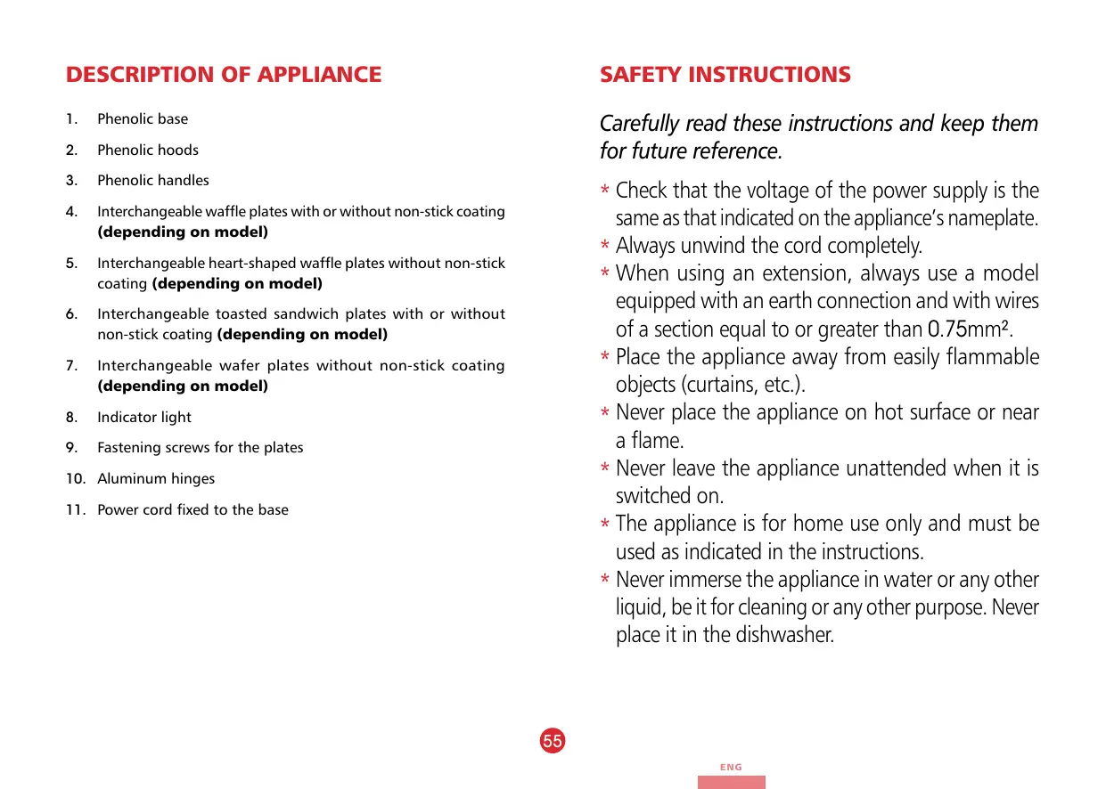 Fastening screws for the plates SAFETY INSTRUCTIONS Carefully read these instructions and keep them for future reference. **Check that the voltage of the power supply is the same as that indicated on the appliance’s nameplate. **Always unwind the cord completely. **When using an extension, always use a model equipped with an earth connection and with wires of a section equal to or greater than 0.75mm². **Place the appliance away from easily flammable objects (curtains, etc.). **Never place the appliance on hot surface or near a flame. **Never leave the appliance unattended when it is switched on. **The appliance is for home use only and must be used as indicated in the instructions. **Never immerse the appliance in water or any other liquid, be it for cleaning or any other purpose. Never place it in the dishwasher.