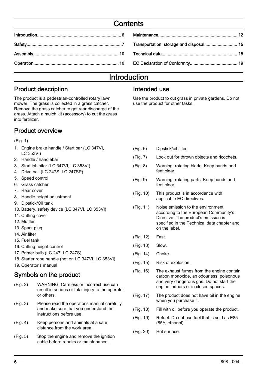 (Fig. 1) 1. Engine brake handle / Start bar (LC 347VI, LC 353VI) 2. Handle / handlebar 3. Start inhibitor (LC 347VI, LC 353VI) 4. Drive bail (LC 247S, LC 247SP) 5. Speed control 6. Grass catcher 7. Rear cover 8. Handle height adjustment 9. Dipstick/Oil tank 10. Battery, safety device (LC 347VI, LC 353VI) 11. Cutting cover 12. Muffler 13. Spark plug 14. Air filter 15. Fuel tank 16. Cutting height control 17. Primer bulb (LC 247, LC 247S) 18. Starter rope handle (not on LC 347VI, LC 353VI) 19. Operator's manual