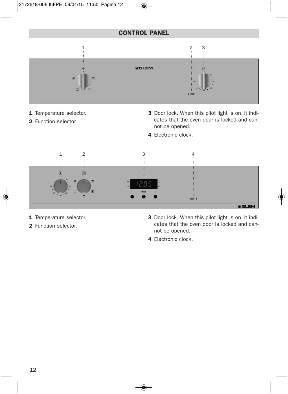 3 Door lock. When this pilot light is on, it indicates that the oven door is locked and cannot be opened.