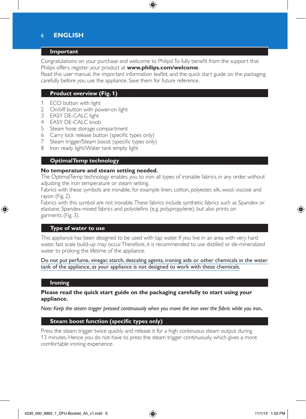 The OptimalTemp technology enables you to iron all types of ironable fabrics, in any order, without adjusting the iron temperature or steam setting. Fabrics with these symbols are ironable, for example linen, cotton, polyester, silk, wool, viscose and rayon (Fig. 2). Fabrics with this symbol are not ironable. These fabrics include synthetic fabrics such as Spandex or elastane, Spandex-mixed fabrics and polyolefins (e.g. polypropylene), but also prints on garments (Fig. 3). Type of water to use This appliance has been designed to be used with tap water. If you live in an area with very hard water, fast scale build-up may occur. Therefore, it is recommended to use distilled or de-mineralized water to prolong the lifetime of the appliance. Do not put perfume, vinegar, starch, descaling agents, ironing aids or other chemicals in the water tank of the appliance, as your appliance is not designed to work with these chemicals. Ironing Please read the quick start guide on the packaging carefully to start using your appliance. Note: Keep the steam trigger pressed continuously when you move the iron over the fabric while you iron. Steam boost function (specific types only) Press the steam trigger twice quickly and release it for a high continuous steam output during 13 minutes. Hence you do not have to press the steam trigger continuously, which gives a more comfortable ironing experience.