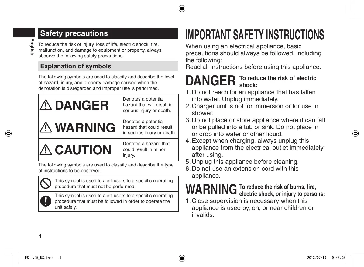 2. Charger unit is not for immersion or for use in shower. 3. Do not place or store appliance where it can fall or be pulled into a tub or sink. Do not place in or drop into water or other liquid. 4. Except when charging, always unplug this appliance from the electrical outlet immediately after using. 5. Unplug this appliance before cleaning. 6. Do not use an extension cord with this appliance. reduce the risk of burns, fire, WARNING Toelectric shock, or injury to persons: 1. Close supervision is necessary when this appliance is used by, on, or near children or invalids.