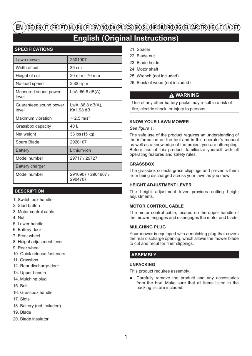 15. Bolt 16. Grassbox handle 17. Slots 18. Battery (not included) 19. Blade 20. Blade insulator