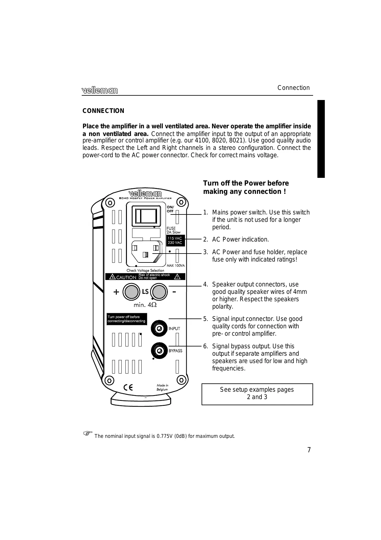 Place the amplifier in a well ventilated area. Never operate the amplifier inside a non ventilated area. Connect the amplifier input to the output of an appropriate pre-amplifier or control amplifier (e.g. our 4100, 8020, 8021). Use good quality audio leads. Respect the Left and Right channels in a stereo configuration. Connect the power-cord to the AC power connector. Check for correct mains voltage.