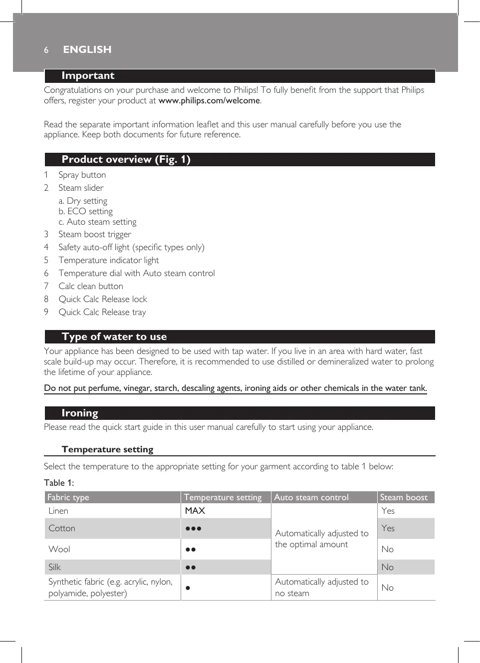 Please read the quick start guide in this user manual carefully to start using your appliance. Temperature setting Select the temperature to the appropriate setting for your garment according to table 1 below: Table 1: Fabric type Linen
