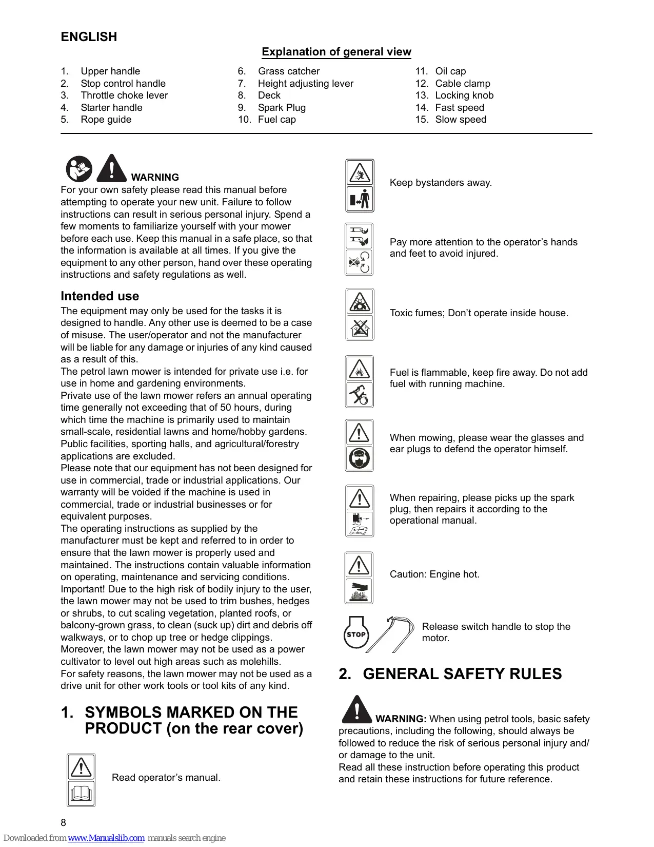 8-5 FOR THE BEST RESULTS WHEN MOWING Note: During operation, when the stop control handle is released, the engine will stop and thus stopping the lawn mower from operating.