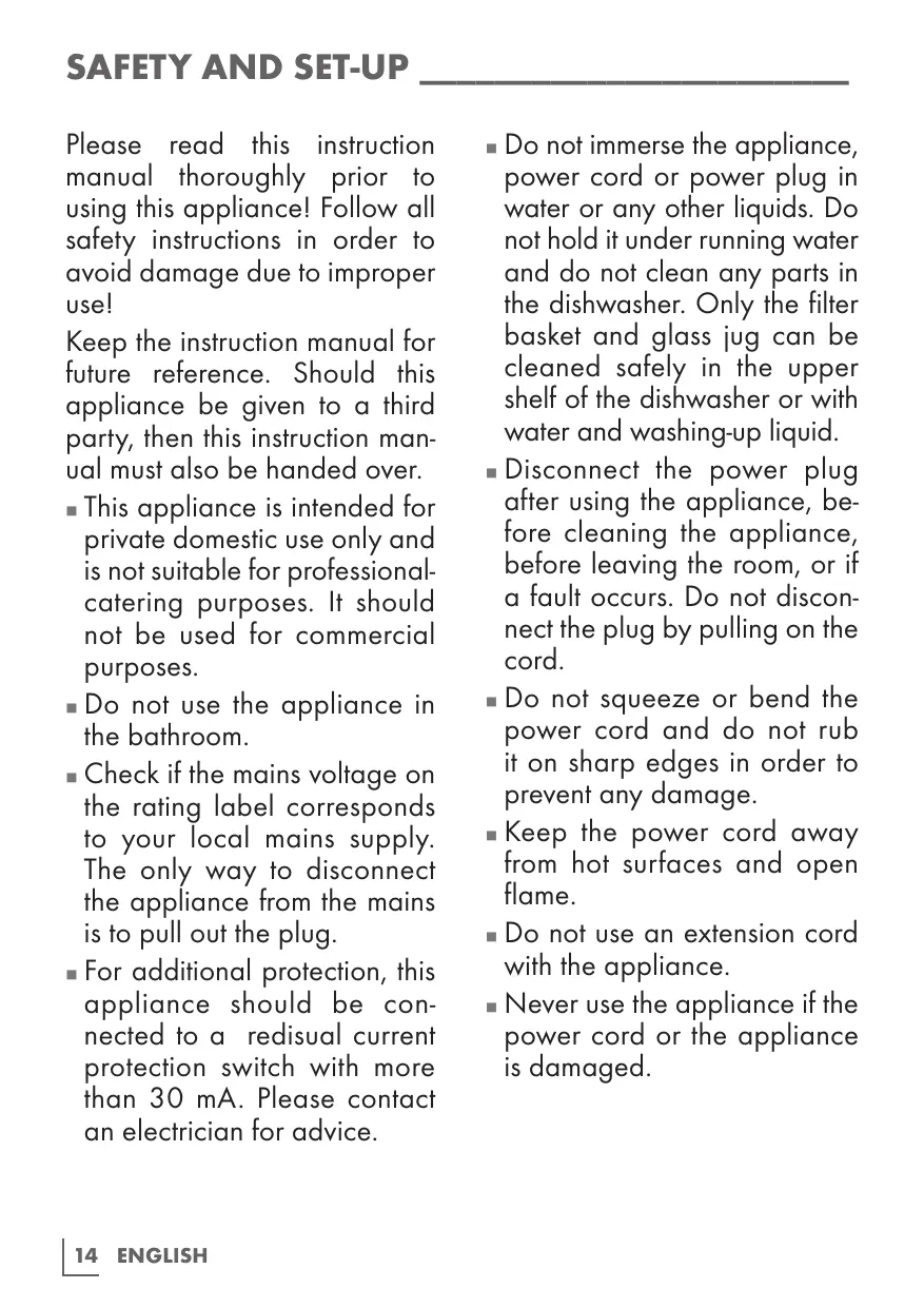 SAFETY AND SET-UP________________________ Please read this instruction manual thoroughly prior to using this appliance! Follow all safety instructions in order to avoid damage due to improper use! Keep the instruction manual for future reference. Should this appliance be given to a third party, then this instruction manual must also be handed over. This appliance is intended for private domestic use only and is not suitable for professionalcatering purposes. It should not be used for commercial purposes. Do not use the appliance in the bathroom. Check if the mains voltage on the rating label corresponds to your local mains supply. The only way to disconnect the appliance from the mains is to pull out the plug. For additional protection, this appliance should be connected to a redisual current protection switch with more than 30 mA. Please contact an electrician for advice.
