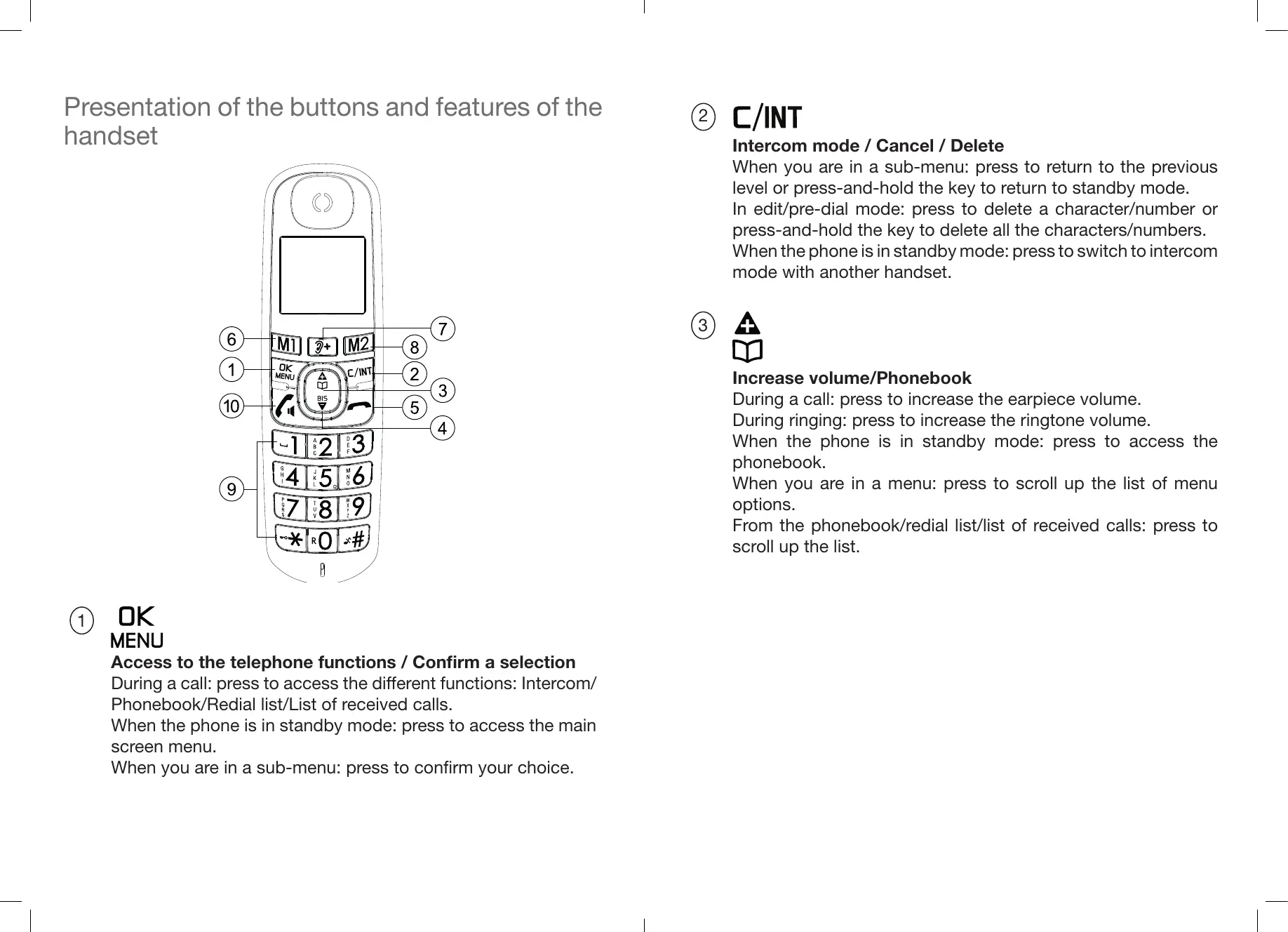 Intercom mode / Cancel / Delete When you are in a sub-menu: press to return to the previous level or press-and-hold the key to return to standby mode. In edit/pre-dial mode: press to delete a character/number or press-and-hold the key to delete all the characters/numbers. When the phone is in standby mode: press to switch to intercom mode with another handset. Increase volume/Phonebook During a call: press to increase the earpiece volume. During ringing: press to increase the ringtone volume. When the phone is in standby mode: press to access the phonebook. When you are in a menu: press to scroll up the list of menu options. From the phonebook/redial list/list of received calls: press to scroll up the list.