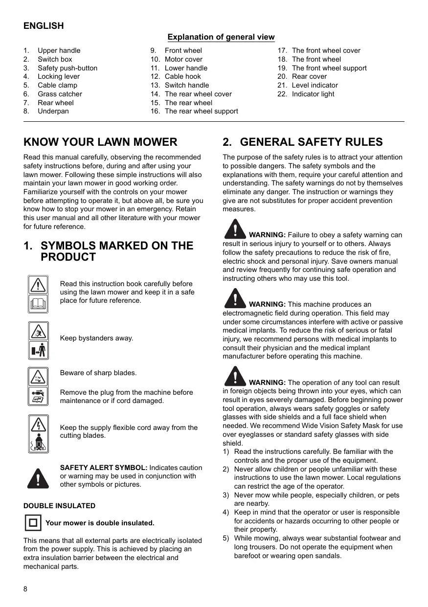 1. SYMBOLS MARKED ON THE PRODUCT Read this instruction book carefully before using the lawn mower and keep it in a safe place for future reference.