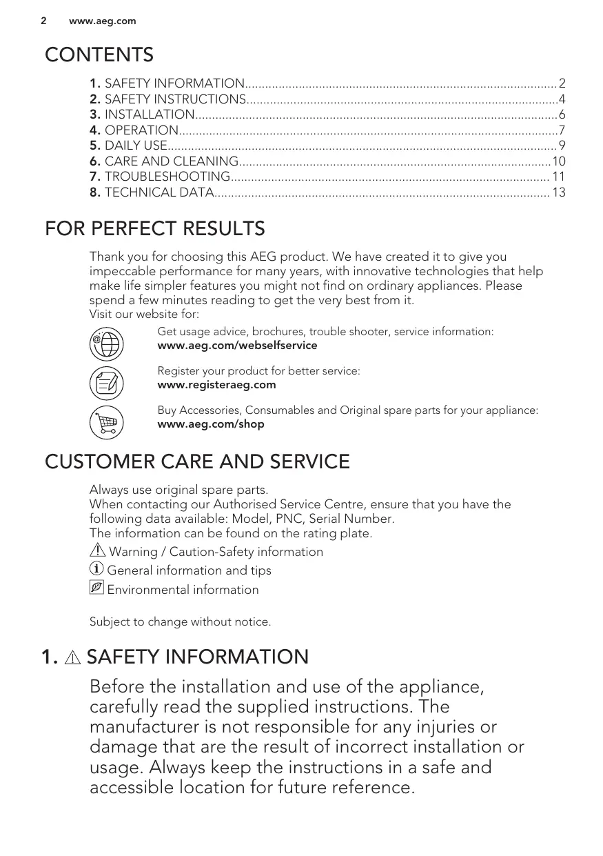 Thank you for choosing this AEG product. We have created it to give you impeccable performance for many years, with innovative technologies that help make life simpler features you might not find on ordinary appliances. Please spend a few minutes reading to get the very best from it. Visit our website for: Get usage advice, brochures, trouble shooter, service information: www.aeg.com/webselfservice Register your product for better service: www.registeraeg.com Buy Accessories, Consumables and Original spare parts for your appliance: www.aeg.com/shop