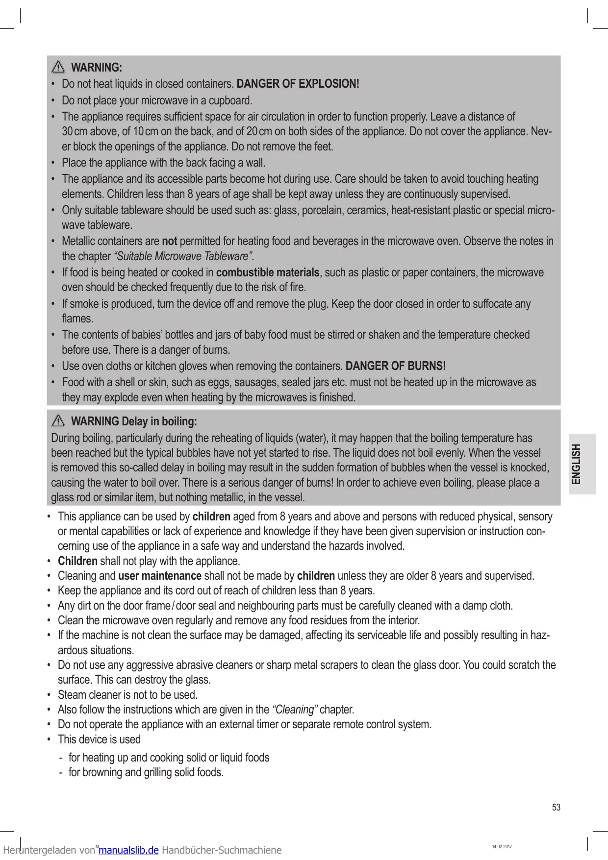 Do not heat liquids in closed containers. DANGER OF EXPLOSION! Do not place your microwave in a cupboard. The appliance requires sufficient space for air circulation in order to function properly. Leave a distance of 30 cm above, of 10 cm on the back, and of 20 cm on both sides of the appliance. Do not cover the appliance. Never block the openings of the appliance. Do not remove the feet. Place the appliance with the back facing a wall. The appliance and its accessible parts become hot during use. Care should be taken to avoid touching heating elements. Children less than 8 years of age shall be kept away unless they are continuously supervised. Only suitable tableware should be used such as: glass, porcelain, ceramics, heat-resistant plastic or special microwave tableware. Metallic containers are not permitted for heating food and beverages in the microwave oven. Observe the notes in the chapter “Suitable Microwave Tableware”. If food is being heated or cooked in combustible materials, such as plastic or paper containers, the microwave oven should be checked frequently due to the risk of fire. If smoke is produced, turn the device off and remove the plug. Keep the door closed in order to suffocate any flames. The contents of babies’ bottles and jars of baby food must be stirred or shaken and the temperature checked before use. There is a danger of burns. Use oven cloths or kitchen gloves when removing the containers. DANGER OF BURNS! Food with a shell or skin, such as eggs, sausages, sealed jars etc. must not be heated up in the microwave as they may explode even when heating by the microwaves is finished. WARNING Delay in boiling: During boiling, particularly during the reheating of liquids (water), it may happen that the boiling temperature has been reached but the typical bubbles have not yet started to rise. The liquid does not boil evenly. When the vessel is removed this so-called delay in boiling may result in the sudden formation of bubbles when the vessel is knocked, causing the water to boil over. There is a serious danger of burns! In order to achieve even boiling, please place a glass rod or similar item, but nothing metallic, in the vessel.