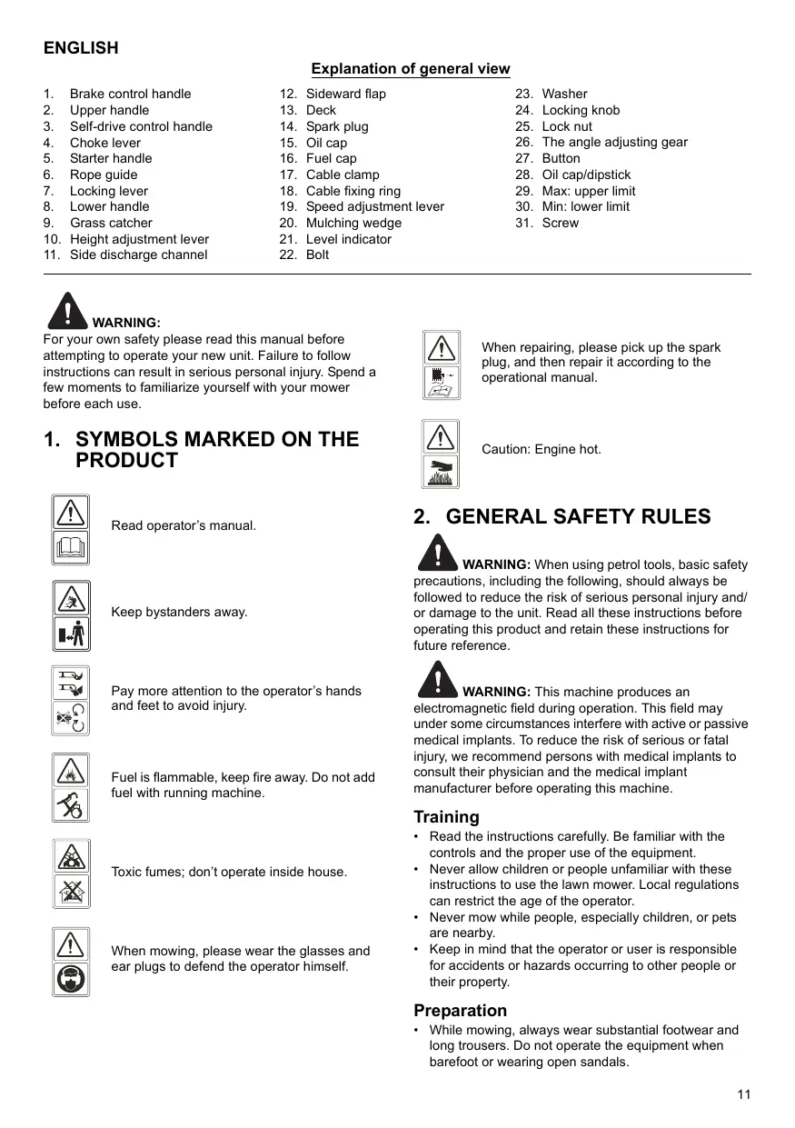 • While mowing, always wear substantial footwear and long trousers. Do not operate the equipment when barefoot or wearing open sandals. 11