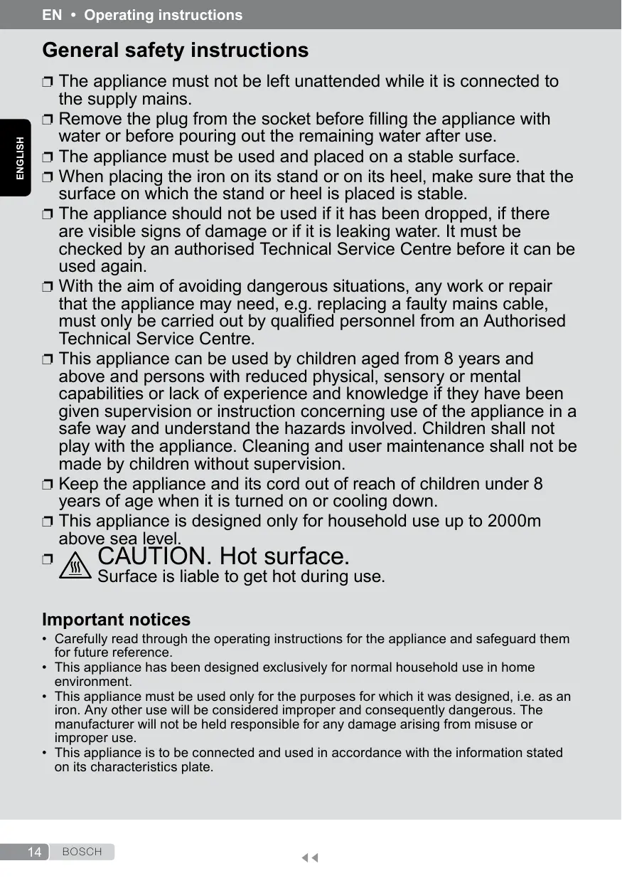 Remove the plug from the socket before illing the appliance with water or before pouring out the remaining water after use. The appliance must be used and placed on a stable surface. When placing the iron on its stand or on its heel, make sure that the surface on which the stand or heel is placed is stable. The appliance should not be used if it has been dropped, if there are visible signs of damage or if it is leaking water. It must be checked by an authorised Technical Service Centre before it can be used again. With the aim of avoiding dangerous situations, any work or repair that the appliance may need, e.g. replacing a faulty mains cable, must only be carried out by qualiied personnel from an Authorised Technical Service Centre. This appliance can be used by children aged from 8 years and above and persons with reduced physical, sensory or mental capabilities or lack of experience and knowledge if they have been given supervision or instruction concerning use of the appliance in a safe way and understand the hazards involved. Children shall not play with the appliance. Cleaning and user maintenance shall not be made by children without supervision. Keep the appliance and its cord out of reach of children under 8 years of age when it is turned on or cooling down. This appliance is designed only for household use up to 2000m above sea level.