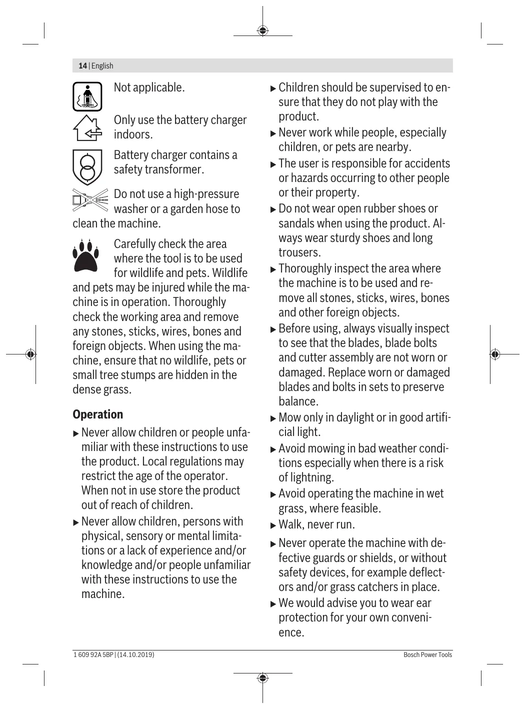 Only use the battery charger indoors. Battery charger contains a safety transformer. Do not use a high-pressure washer or a garden hose to clean the machine. Carefully check the area where the tool is to be used for wildlife and pets. Wildlife and pets may be injured while the machine is in operation. Thoroughly check the working area and remove any stones, sticks, wires, bones and foreign objects. When using the machine, ensure that no wildlife, pets or small tree stumps are hidden in the dense grass. Operation u Never allow children or people unfamiliar with these instructions to use the product. Local regulations may restrict the age of the operator. When not in use store the product out of reach of children. u Never allow children, persons with physical, sensory or mental limitations or a lack of experience and/or knowledge and/or people unfamiliar with these instructions to use the machine.