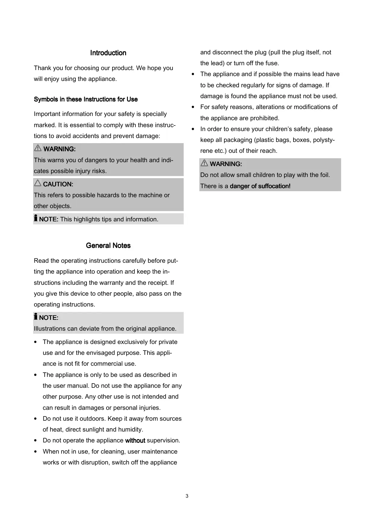 NING: cates possible injury risks. Do not allow small children to play with the foil. CAUTION: There is a danger of suffocation! This refers to possible hazards to the machine or other objects. NOTE: NOTE: This highlights tips and information. General Notes Read the operating instructions carefully before putting the appliance into operation and keep the instructions including the warranty and the receipt. If you give this device to other people, also pass on the operating instructions. NOTE: NOTE: Illustrations can deviate from the original appliance.