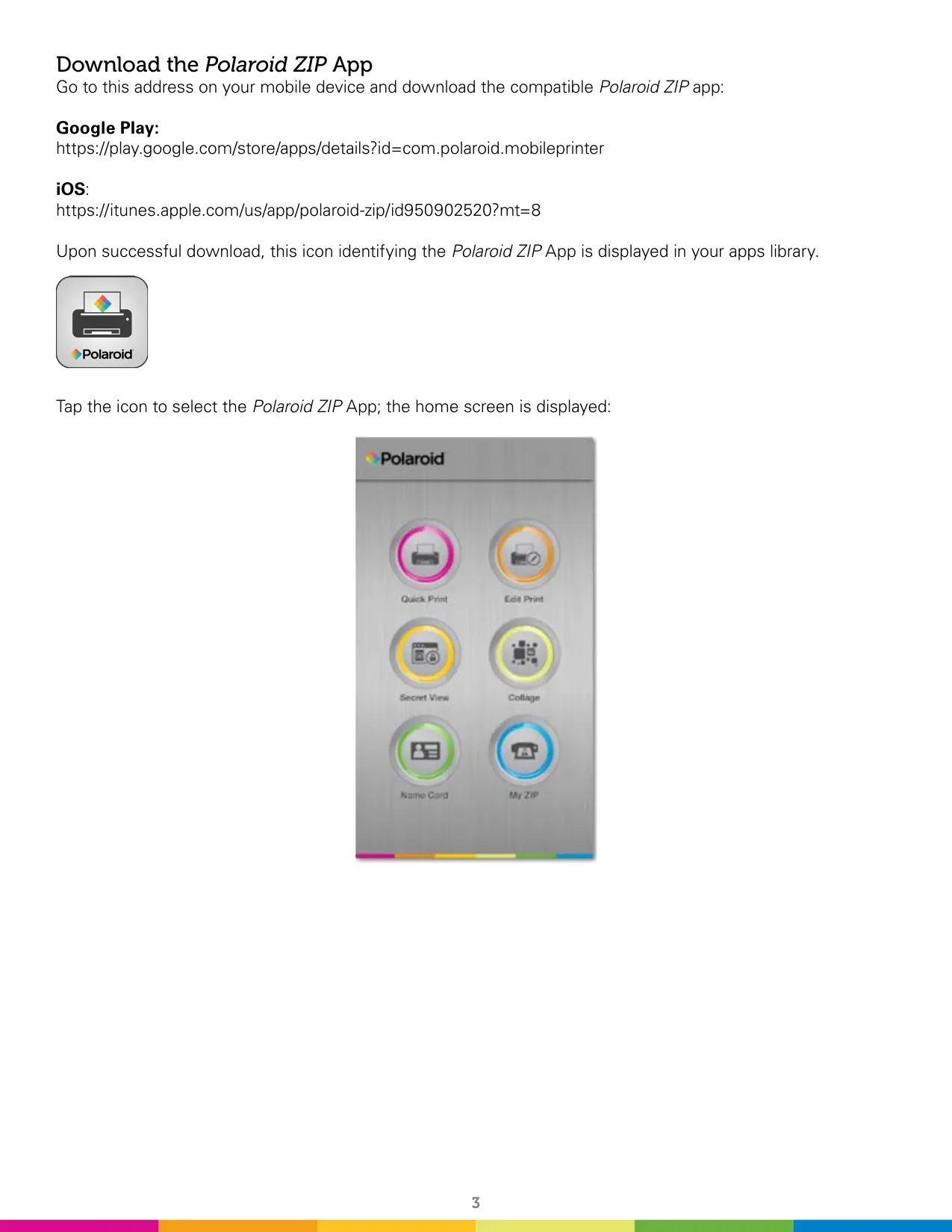 Download the Polaroid ZIP App Go to this address on your mobile device and download the compatible Polaroid ZIP app: Google Play: https://play.google.com/store/apps/details?id=com.polaroid.mobileprinter iOS: https://itunes.apple.com/us/app/polaroid-zip/id950902520?mt=8 Upon successful download, this icon identifying the Polaroid ZIP App is displayed in your apps library. Tap the icon to select the Polaroid ZIP App; the home screen is displayed: