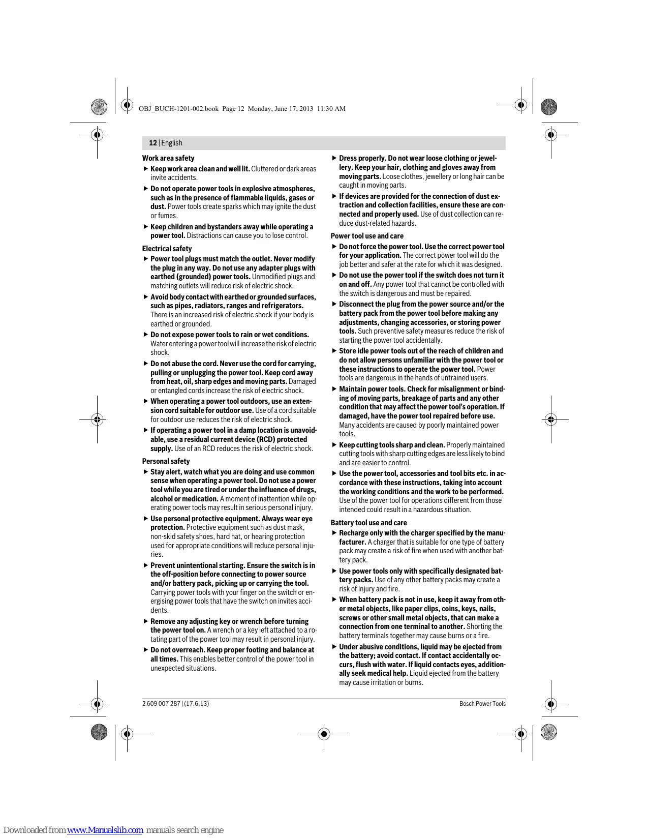 OBJ_BUCH-1201-002.book Page 13 Monday, June 17, 2013 11:30 AM English | 13 Service Have your power tool serviced by a qualified repair person using only identical replacement parts. This will ensure that the safety of the power tool is maintained.