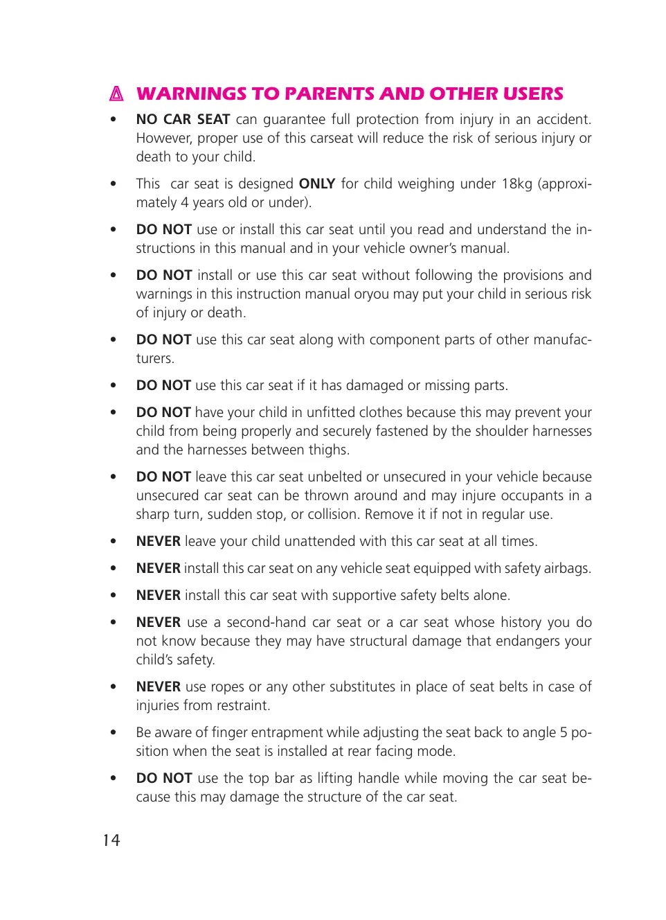 DO NOT install or use this car seat without following the provisions and warnings in this instruction manual oryou may put your child in serious risk of injury or death.