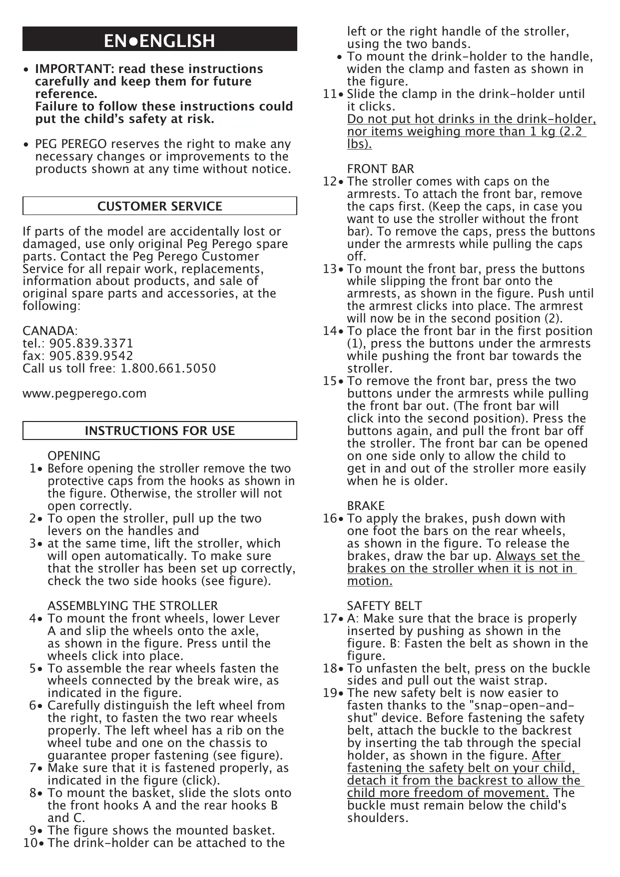 - PEG PEREGO reserves the right to make any necessary changes or improvements to the products shown at any time without notice. CUSTOMER SERVICE If parts of the model are accidentally lost or damaged, use only original Peg Perego spare parts. Contact the Peg Perego Customer Service for all repair work, replacements, information about products, and sale of original spare parts and accessories, at the following: CANADA: tel.: 905.839.3371 fax: 905.839.9542 Call us toll free: 1.800.661.5050 www.pegperego.com