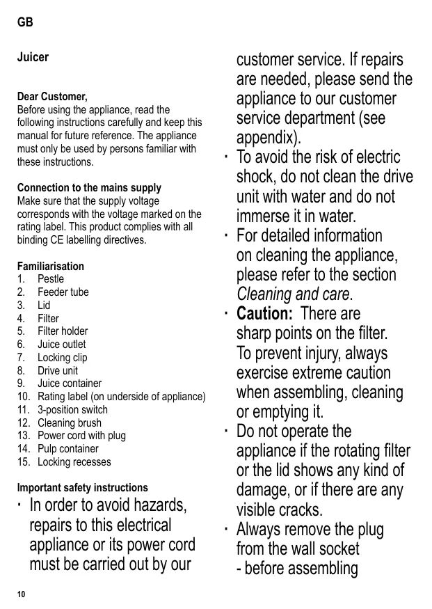 To avoid the risk of electric shock, do not clean the drive unit with water and do not immerse it in water. For detailed information on cleaning the appliance, please refer to the section Cleaning and care. Caution: There are sharp points on the filter. To prevent injury, always exercise extreme caution when assembling, cleaning or emptying it. Do not operate the appliance if the rotating filter or the lid shows any kind of damage, or if there are any visible cracks. Always remove the plug from the wall socket - before assembling