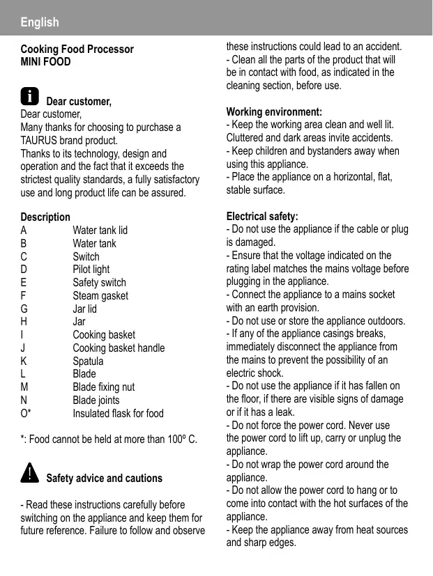 English Cooking Food Processor MINI FOOD Dear customer, Dear customer, Many thanks for choosing to purchase a TAURUS brand product. Thanks to its technology, design and operation and the fact that it exceeds the strictest quality standards, a fully satisfactory use and long product life can be assured. Description A Water tank lid B Water tank C Switch D Pilot light E Safety switch F Steam gasket G Jar lid H Jar I Cooking basket J Cooking basket handle K Spatula L Blade M Blade fixing nut N Blade joints O* Insulated flask for food *: Food cannot be held at more than 100º C. Safety advice and cautions - Read these instructions carefully before switching on the appliance and keep them for future reference. Failure to follow and observe