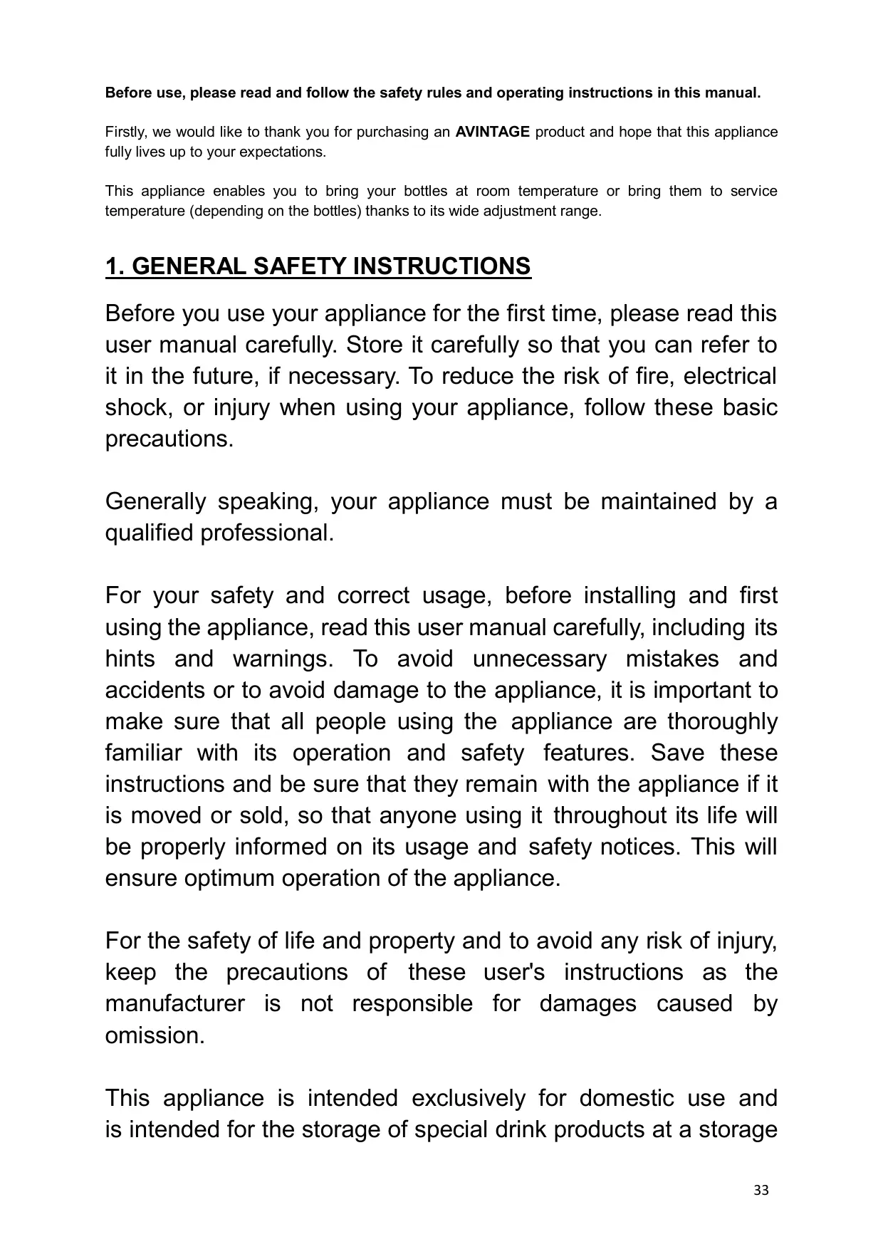 Before you use your appliance for the first time, please read this user manual carefully. Store it carefully so that you can refer to it in the future, if necessary. To reduce the risk of fire, electrical shock, or injury when using your appliance, follow these basic precautions. Generally speaking, your appliance must be maintained by a qualified professional. For your safety and correct usage, before installing and first using the appliance, read this user manual carefully, including its hints and warnings. To avoid unnecessary mistakes and accidents or to avoid damage to the appliance, it is important to make sure that all people using the appliance are thoroughly familiar with its operation and safety features. Save these instructions and be sure that they remain with the appliance if it is moved or sold, so that anyone using it throughout its life will be properly informed on its usage and safety notices. This will ensure optimum operation of the appliance. For the safety of life and property and to avoid any risk of injury, keep the precautions of these user's instructions as the manufacturer is not responsible for damages caused by omission. This appliance is intended exclusively for domestic use and is intended for the storage of special drink products at a storage
