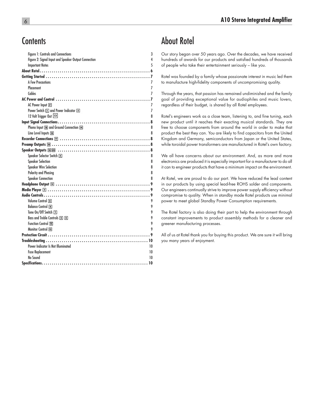 Contents About Rotel Our story began over 50 years ago. Over the decades, we have received hundreds of awards for our products and satisfied hundreds of thousands of people who take their entertainment seriously – like you. Rotel was founded by a family whose passionate interest in music led them to manufacture high-fidelity components of uncompromising quality. Through the years, that passion has remained undiminished and the family goal of providing exceptional value for audiophiles and music lovers, regardless of their budget, is shared by all Rotel employees. Rotel’s engineers work as a close team, listening to, and fine tuning, each new product until it reaches their exacting musical standards. They are free to choose components from around the world in order to make that product the best they can. You are likely to find capacitors from the United Kingdom and Germany, semiconductors from Japan or the United States, while toroidal power transformers are manufactured in Rotel’s own factory. We all have concerns about our environment. And, as more and more electronics are produced it is especially important for a manufacturer to do all it can to engineer products that have a minimum impact on the environment. At Rotel, we are proud to do our part. We have reduced the lead content in our products by using special lead-free ROHS solder and components. Our engineers continually strive to improve power supply efficiency without compromise to quality. When in standby mode Rotel products use minimal power to meet global Standby Power Consumption requirements. The Rotel factory is also doing their part to help the environment through constant improvements to product assembly methods for a cleaner and greener manufacturing processes. All of us at Rotel thank you for buying this product. We are sure it will bring you many years of enjoyment. English Getting Started Thank you for purchasing the Rotel A10 Stereo Integrated Amplifier. When used in a high-quality music audio system, it will provide years of musical enjoyment. The amplifier is a full featured, high performance component. All aspects of the design have been optimized to retain the full dynamic range and subtle nuances of your music. The unit has a highly regulated power supply incorporating a Rotel custom-designed toroidal power transformer. This low impedance power supply has ample power reserves, which enables the unit to easily reproduce the most demanding audio signals. This type of design is more expensive to manufacture, but it is better for the music. The printed circuit boards (PCB) are designed with Symmetrical Circuit Traces. This insures that the precise timing of the music is maintained and faithfully recreated. The circuitry uses metal film resistors and polystyrene or polypropylene capacitors in important signal paths. All aspects of this design have been examined to ensure the most faithful music reproduction. The main functions of the A10 are easy to install and use. If you have experience with other stereo systems, you shouldn’t find anything perplexing. Simply plug in the associated components and enjoy. A Few Precautions