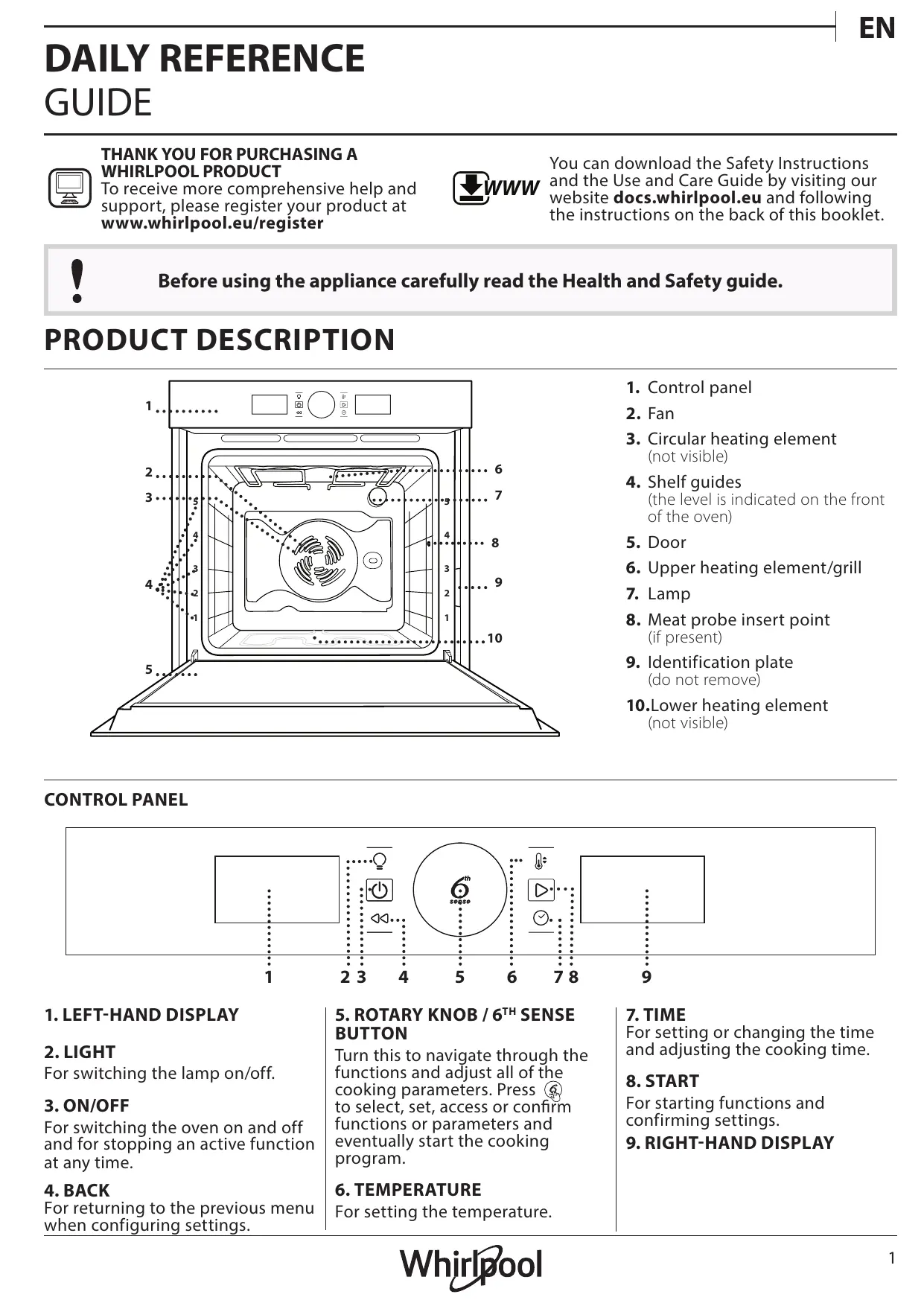 WHIRLPOOL PRODUCT To receive more comprehensive help and support, please register your product at www.whirlpool.eu/register WWW You can download the Safety Instructions and the Use and Care Guide by visiting our website docs.whirlpool.eu and following the instructions on the back of this booklet. Before using the appliance carefully read the Health and Safety guide. PRODUCT DESCRIPTION