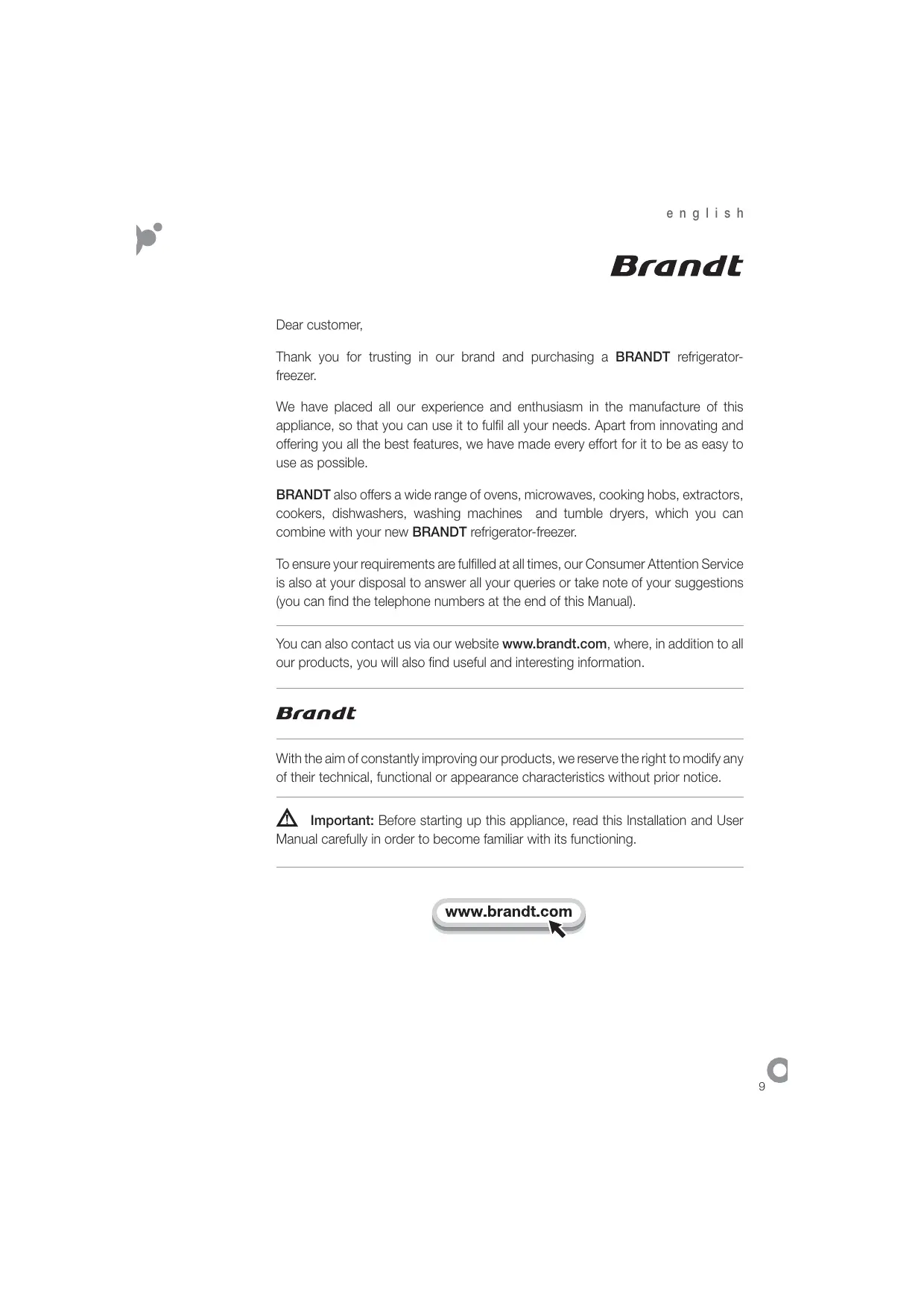 e n g l i s h Dear customer, Thank you for trusting in our brand and purchasing a BRANDT refrigeratorfreezer. We have placed all our experience and enthusiasm in the manufacture of this appliance, so that you can use it to fulfil all your needs. Apart from innovating and offering you all the best features, we have made every effort for it to be as easy to use as possible. BRANDT also offers a wide range of ovens, microwaves, cooking hobs, extractors, cookers, dishwashers, washing machines and tumble dryers, which you can combine with your new BRANDT refrigerator-freezer. To ensure your requirements are fulfilled at all times, our Consumer Attention Service is also at your disposal to answer all your queries or take note of your suggestions (you can find the telephone numbers at the end of this Manual). You can also contact us via our website www.brandt.com, where, in addition to all our products, you will also find useful and interesting information. With the aim of constantly improving our products, we reserve the right to modify any of their technical, functional or appearance characteristics without prior notice. Important: Before starting up this appliance, read this Installation and User Manual carefully in order to become familiar with its functioning.