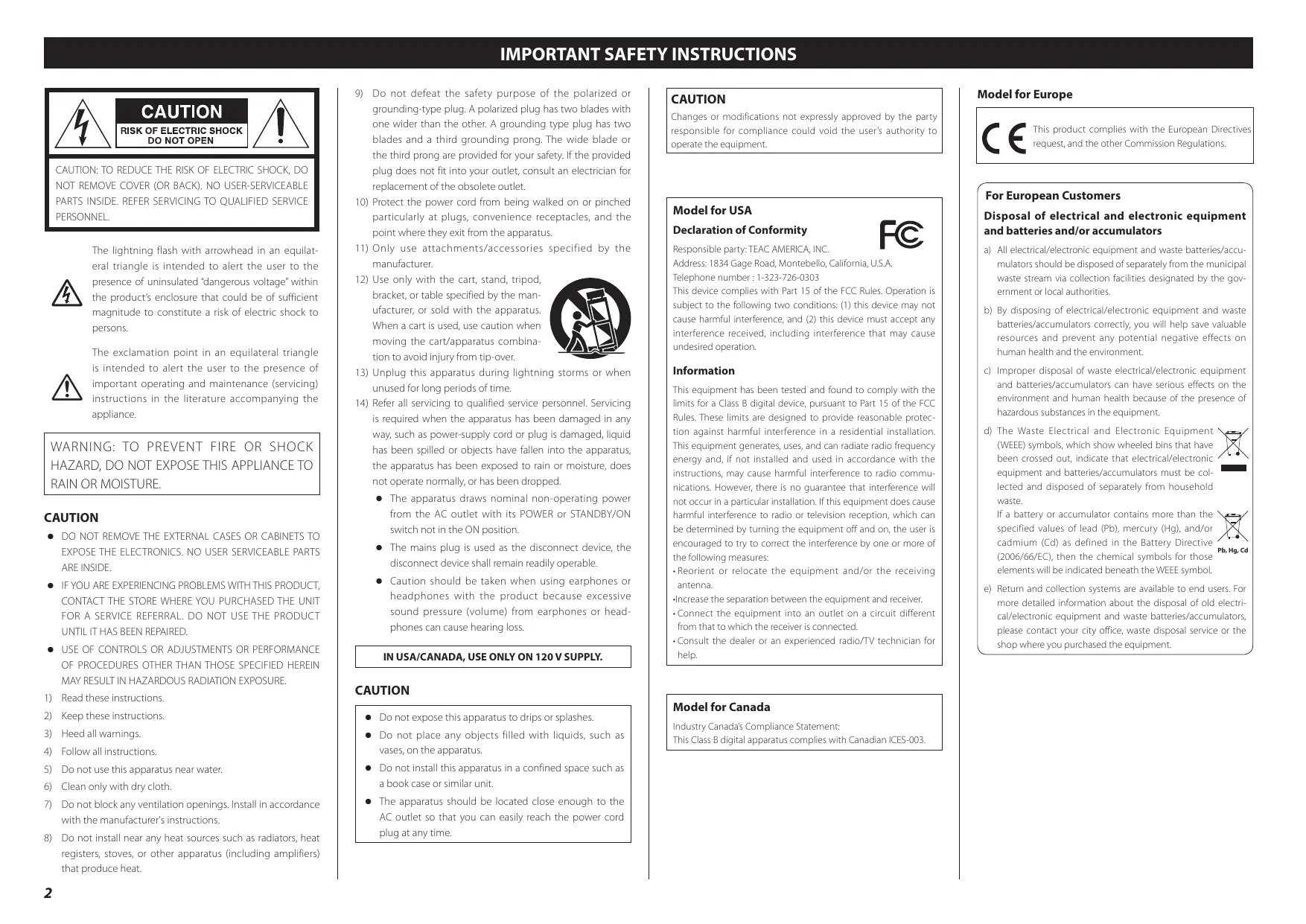 Responsible party: TEAC AMERICA, INC. Address: 1834 Gage Road, Montebello, California, U.S.A. Telephone number : 1-323-726-0303 This device complies with Part.15 of FCC Rules. Operation is subject to the following two conditions: (1) this device may not cause harmful interference, and (2) this device must accept any interference received, including interference that may cause undesired operation.
