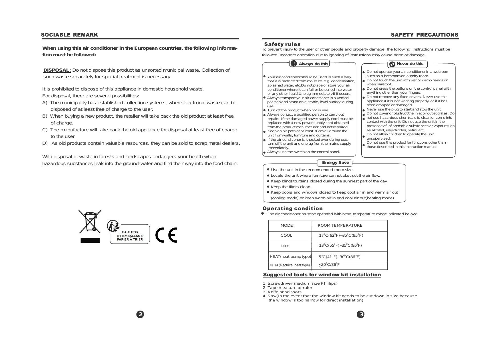 DISPOSAL: Do not dispose this product as unsorted municipal waste. Collection of such waste separately for special treatment is necessary. It is prohibited to dispose of this appliance in domestic household waste. For disposal, there are several possibilities: A) The municipality has established collection systems, where electronic waste can be disposed of at least free of charge to the user. B) When buying a new product, the retailer will take back the old product at least free of charge. C) The manufacture will take back the old appliance for disposal at least free of charge to the user. D) As old products contain valuable resources, they can be sold to scrap metal dealers. Never do this Always do this Do not operate your air conditioner in a wet room such as a bathroom or laundry room. Do not touch the unit with wet or damp hands or when barefoot. Do not press the buttons on the control panel with anything other than your fingers. Do not remove any fixed covers. Never use this appliance if it is not working properly, or if it has been dropped or damaged. Never use the plug to start and stop the unit. Do not cover or obstruct the inlet or outlet grilles. Do not use hazardous chemicals to clean or come into contact with the unit. Do not use the unit in the presence of inflammable substances or vapour such as alcohol, insecticides, petrol,etc. Do not allow children to operate the unit unsupervised. Do not use this product for functions other than those described in this instruction manual. Your air conditioner should be used in such a way that it is protected from moisture. e.g. condensation, splashed water, etc.Do not place or store your air conditioner where it can fall or be pulled into water or any other liquid.Unplug immediately if it occurs. Always transport your air conditioner in a vertical position and stand on a stable, level surface during use. Turn off the product when not in use. Always contact a qualified person to carry out repairs. If the damaged power supply cord must be replaced with a new power supply cord obtained from the product manufacturer and not repaired. Keep an air path of at least 30cm all around the unit from walls, furniture and curtains. If the air conditioner is knocked over during use, turn off the unit and unplug from the mains supply immediately. Always use the switch on the control panel. Wild disposal of waste in forests and landscapes endangers your health when hazardous substances leak into the ground-water and find their way into the food chain. Energy Save Use the unit in the recommended room size. Locate the unit where furniture cannot obstruct the air flow. Keep blinds/curtains closed during the sunniest part of the day. Keep the filters clean. Keep doors and windows closed to keep cool air in and warm air out (cooling mode) or keep warm air in and cool air out(heating mode).. Oper ating condition The air conditioner must be operated within the temperature range indicated below: MODE ROOM TEMPERATURE COOL 17OC(62OF)~35OC(95OF) DRY 13OC(55OF)~35OC(95OF) HEAT(heat pump type) 5OC(41OF)~30OC(86OF) HEAT(electrical heat type) <30OC/86OF Suggested tools for window kit installation