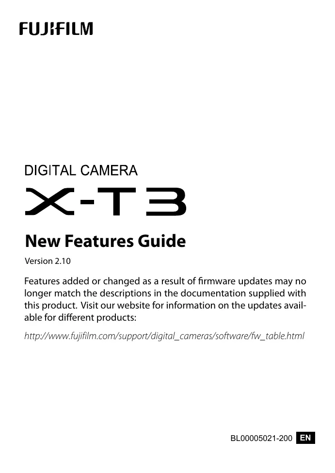 BL00005021-200 EN Contents X-T3 firmware version 2.10 adds or updates the features listed below. For information on earlier versions, visit the following website. http://fujifilm-dsc.com/en/manual/ No.
