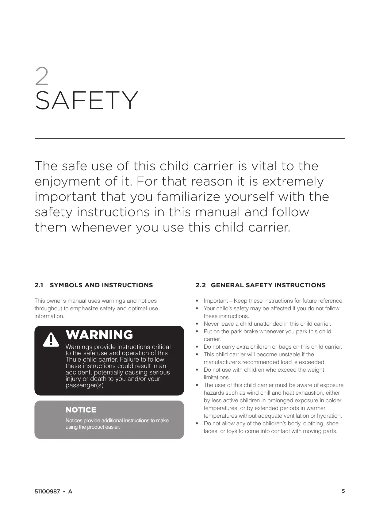 Warnings provide instructions critical to the safe use and operation of this Thule child carrier. Failure to follow these instructions could result in an accident, potentially causing serious injury or death to you and/or your passenger(s).