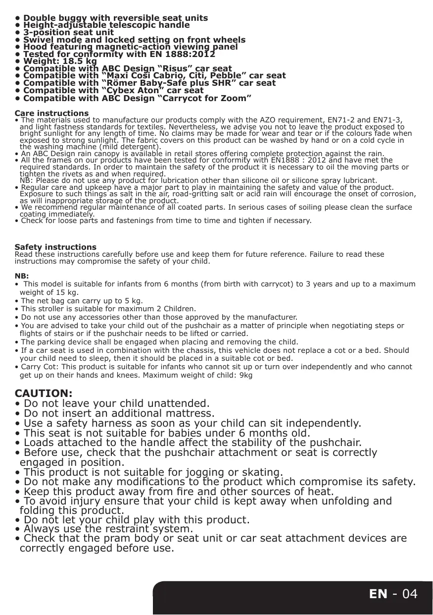 Instructions de service - FR (10-12) Double buggy with reversible seat units Height-adjustable telescopic handle 3-position seat unit Swivel mode and locked setting on front wheels Hood featuring magnetic-action viewing panel Tested for conformity with EN 1888:2012 Weight: 18.5 kg Compatible with ABC Design “Risus” car seat Compatible with “Maxi Cosi Cabrio, Citi, Pebble” car seat Compatible with “Römer Baby-Safe plus SHR” car seat Compatible with “Cybex Aton” car seat Compatible with ABC Design “Carrycot for Zoom” Care instructions