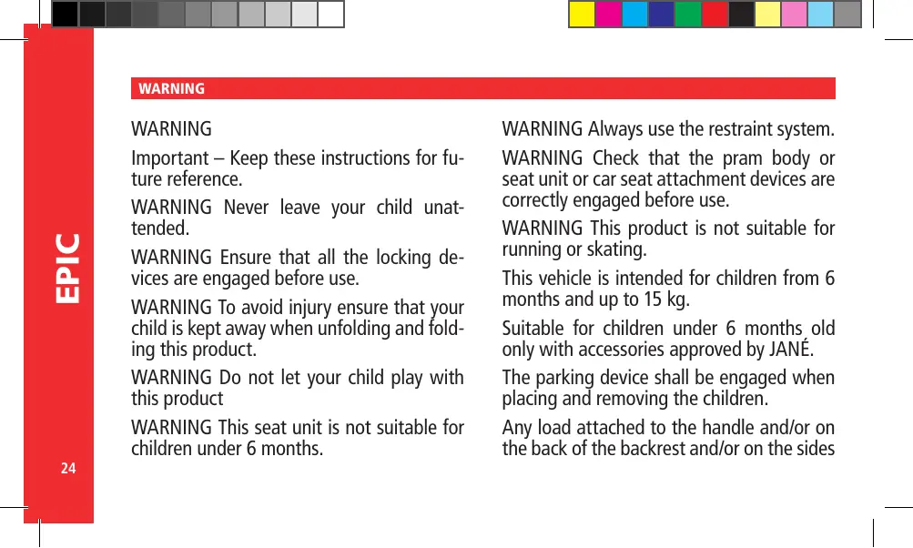 WARNING Check that the pram body or seat unit or car seat attachment devices are correctly engaged before use. WARNING This product is not suitable for running or skating. This vehicle is intended for children from 6 months and up to 15 kg. Suitable for children under 6 months old only with accessories approved by JANÉ. The parking device shall be engaged when placing and removing the children. Any load attached to the handle and/or on the back of the backrest and/or on the sides