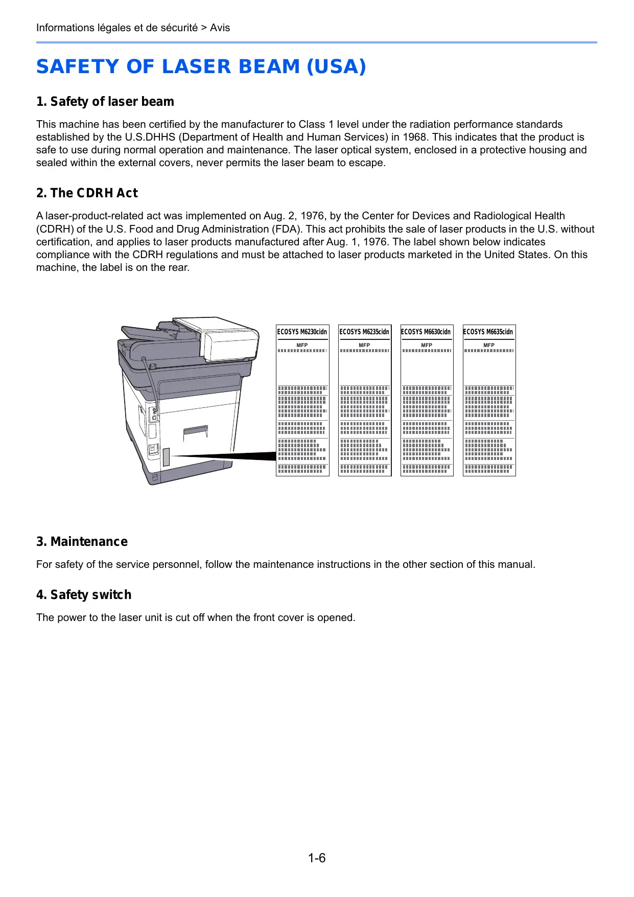 2. The CDRH Act A laser-product-related act was implemented on Aug. 2, 1976, by the Center for Devices and Radiological Health (CDRH) of the U.S. Food and Drug Administration (FDA). This act prohibits the sale of laser products in the U.S. without certification, and applies to laser products manufactured after Aug. 1, 1976. The label shown below indicates compliance with the CDRH regulations and must be attached to laser products marketed in the United States. On this machine, the label is on the rear.