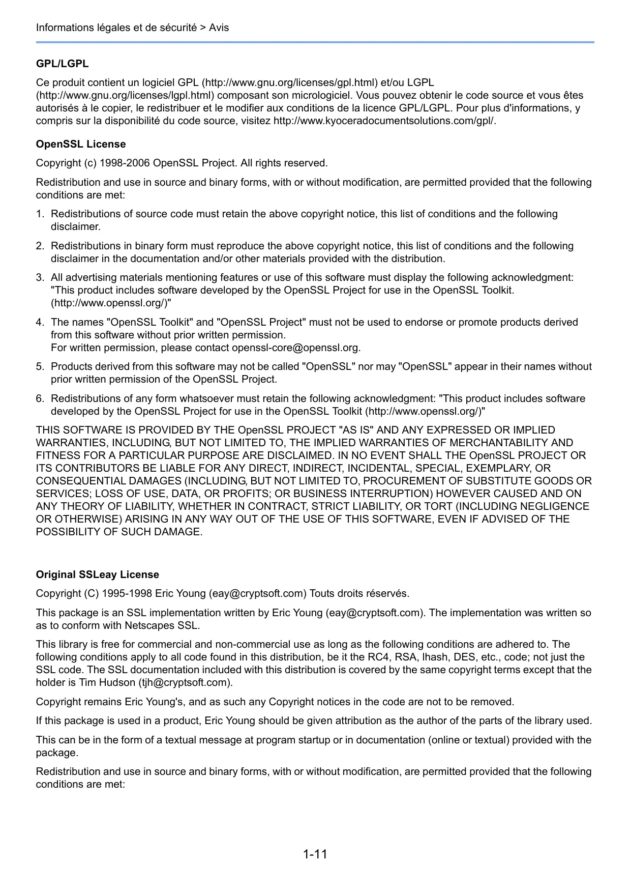 Informations légales et de sécurité > Avis GPL/LGPL Ce produit contient un logiciel GPL (http://www.gnu.org/licenses/gpl.html) et/ou LGPL (http://www.gnu.org/licenses/lgpl.html) composant son micrologiciel. Vous pouvez obtenir le code source et vous êtes autorisés à le copier, le redistribuer et le modifier aux conditions de la licence GPL/LGPL. Pour plus d'informations, y compris sur la disponibilité du code source, visitez http://www.kyoceradocumentsolutions.com/gpl/. OpenSSL License Copyright (c) 1998-2006 OpenSSL Project. All rights reserved. Redistribution and use in source and binary forms, with or without modification, are permitted provided that the following conditions are met: 1. Redistributions of source code must retain the above copyright notice, this list of conditions and the following disclaimer. 2. Redistributions in binary form must reproduce the above copyright notice, this list of conditions and the following disclaimer in the documentation and/or other materials provided with the distribution. 3. All advertising materials mentioning features or use of this software must display the following acknowledgment: "This product includes software developed by the OpenSSL Project for use in the OpenSSL Toolkit. (http://www.openssl.org/)" 4. The names "OpenSSL Toolkit" and "OpenSSL Project" must not be used to endorse or promote products derived from this software without prior written permission. For written permission, please contact openssl-core@openssl.org. 5. Products derived from this software may not be called "OpenSSL" nor may "OpenSSL" appear in their names without prior written permission of the OpenSSL Project. 6. Redistributions of any form whatsoever must retain the following acknowledgment: "This product includes software developed by the OpenSSL Project for use in the OpenSSL Toolkit (http://www.openssl.org/)" THIS SOFTWARE IS PROVIDED BY THE OpenSSL PROJECT "AS IS" AND ANY EXPRESSED OR IMPLIED WARRANTIES, INCLUDING, BUT NOT LIMITED TO, THE IMPLIED WARRANTIES OF MERCHANTABILITY AND FITNESS FOR A PARTICULAR PURPOSE ARE DISCLAIMED. IN NO EVENT SHALL THE OpenSSL PROJECT OR ITS CONTRIBUTORS BE LIABLE FOR ANY DIRECT, INDIRECT, INCIDENTAL, SPECIAL, EXEMPLARY, OR CONSEQUENTIAL DAMAGES (INCLUDING, BUT NOT LIMITED TO, PROCUREMENT OF SUBSTITUTE GOODS OR SERVICES; LOSS OF USE, DATA, OR PROFITS; OR BUSINESS INTERRUPTION) HOWEVER CAUSED AND ON ANY THEORY OF LIABILITY, WHETHER IN CONTRACT, STRICT LIABILITY, OR TORT (INCLUDING NEGLIGENCE OR OTHERWISE) ARISING IN ANY WAY OUT OF THE USE OF THIS SOFTWARE, EVEN IF ADVISED OF THE POSSIBILITY OF SUCH DAMAGE.