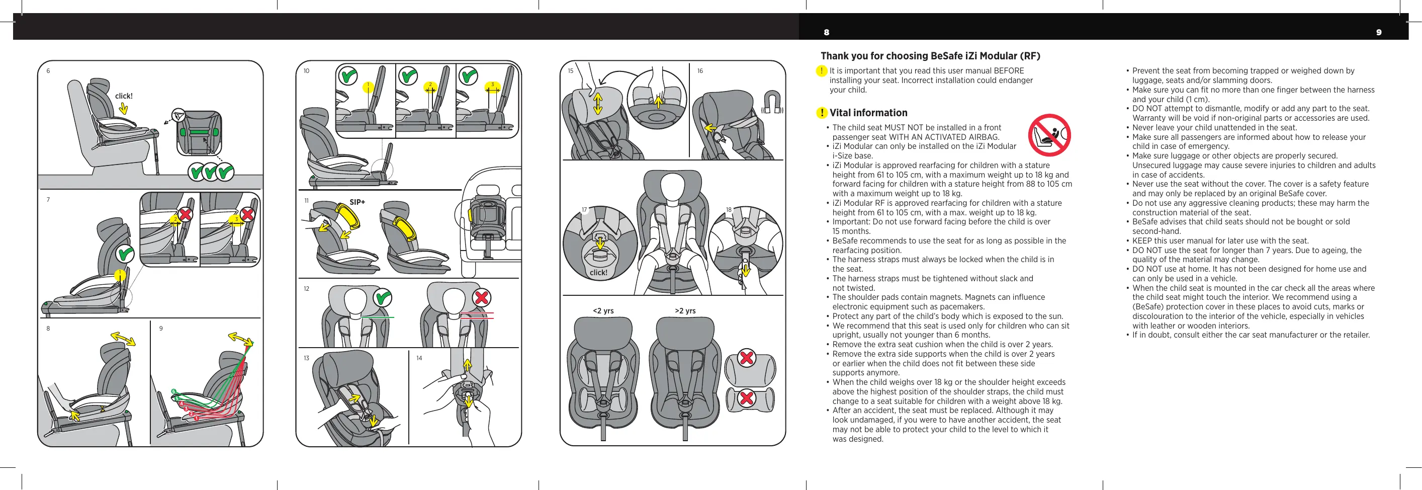 • iZi Modular can only be installed on the iZi Modular i-Size base. • iZi Modular is approved rearfacing for children with a stature height from 61 to 105 cm, with a maximum weight up to 18 kg and forward facing for children with a stature height from 88 to 105 cm with a maximum weight up to 18 kg. • iZi Modular RF is approved rearfacing for children with a stature height from 61 to 105 cm, with a max. weight up to 18 kg. • Important: Do not use forward facing before the child is over 15 months. • BeSafe recommends to use the seat for as long as possible in the rearfacing position. • The harness straps must always be locked when the child is in the seat. • The harness straps must be tightened without slack and not twisted. • The shoulder pads contain magnets. Magnets can influence electronic equipment such as pacemakers. • Protect any part of the child’s body which is exposed to the sun. • We recommend that this seat is used only for children who can sit upright, usually not younger than 6 months. • Remove the extra seat cushion when the child is over 2 years. • Remove the extra side supports when the child is over 2 years or earlier when the child does not fit between these side supports anymore. • When the child weighs over 18 kg or the shoulder height exceeds above the highest position of the shoulder straps, the child must change to a seat suitable for children with a weight above 18 kg. • After an accident, the seat must be replaced. Although it may look undamaged, if you were to have another accident, the seat may not be able to protect your child to the level to which it was designed.