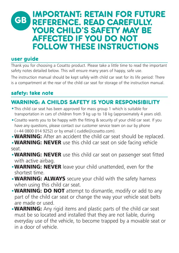 user guide Thank you for choosing a Cosatto product. Please take a little time to read the important safety notes detailed below. This will ensure many years of happy, safe use. The instruction manual should be kept safely with child car seat for its life period: There is a compartment at the rear of the child car seat for storage of the instruction manual. safety: take note