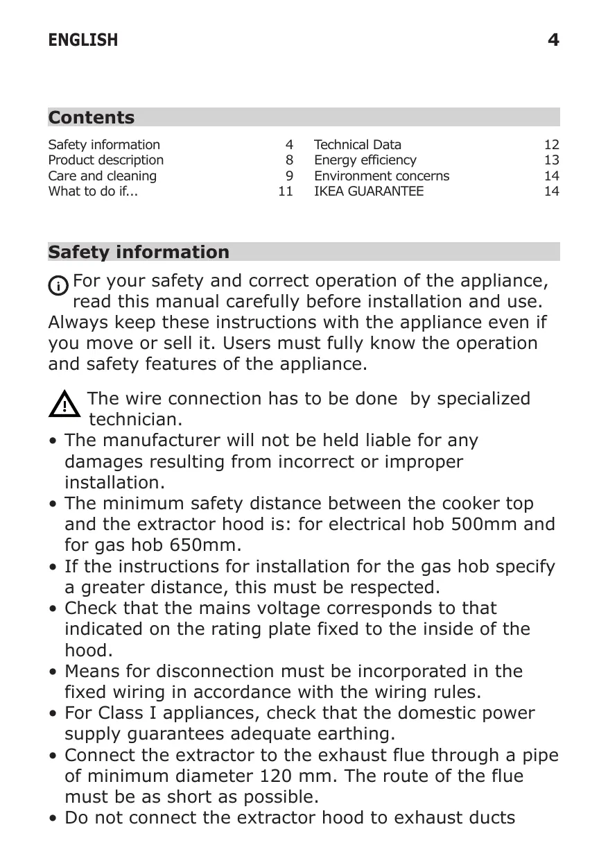 The wire connection has to be done by specialized technician. The manufacturer will not be held liable for any damages resulting from incorrect or improper installation. The minimum safety distance between the cooker top and the extractor hood is: for electrical hob 500mm and for gas hob 650mm. If the instructions for installation for the gas hob specify a greater distance, this must be respected. Check that the mains voltage corresponds to that indicated on the rating plate fixed to the inside of the hood. Means for disconnection must be incorporated in the fixed wiring in accordance with the wiring rules. For Class I appliances, check that the domestic power supply guarantees adequate earthing. Connect the extractor to the exhaust flue through a pipe of minimum diameter 120 mm. The route of the flue must be as short as possible. Do not connect the extractor hood to exhaust ducts ENGLISH