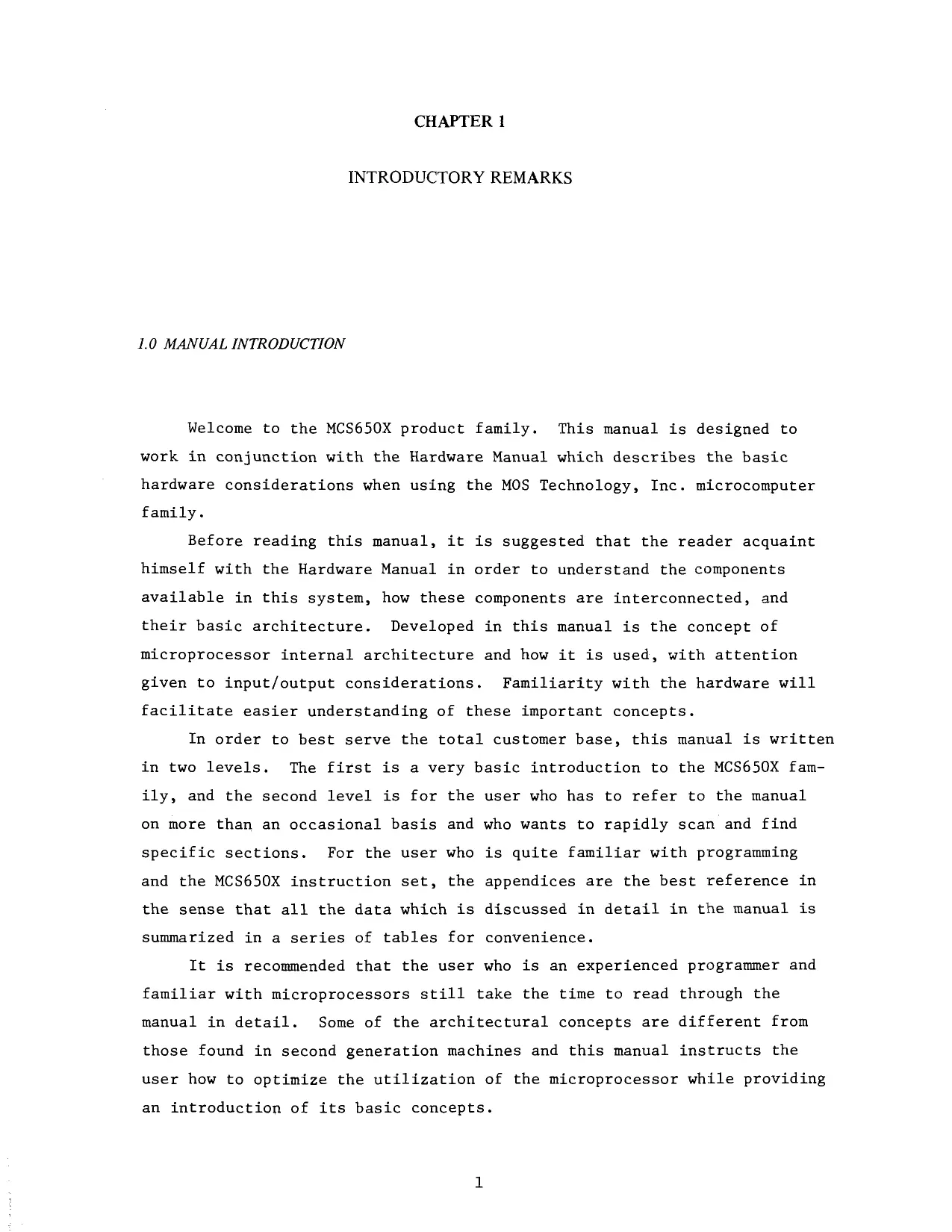 Welcome to the MCS650X product family. This manual is designed to work in conjunction with the Hardware Manual which describes the basic hardware considerations when using the MOS Technology, Inc. microcomputer family. Before reading this manual, it is suggested that the reader acquaint himself with the Hardware Manual in order available in this system, how thesecomponents are interconnected, and their basic architecture. to understand the components Developed in this manual is the concept of microprocessor internal architecture and how it is used, with attention given to input/output considerations. Familiarity with the hardware will facilitate easier understanding of these important concepts. In order to best serve the total customer base, this manual is written in two levels. ily, and the The first is a very basic second level is for the user introduction to the MCS650X fam who has to refer to the manual on more than an occasional basis and who wants to rapidly scan and find specific sections. For the user who is quite familiar with programming and the MCS650X instruction set, the appendices are the best reference in the sense that all the data which is discussed in detail in the manual is summarized in a series of tables for convenience. It is recommended that the user who is an experienced programmer and familiar with microprocessors still take the time to read through the manual in detail. Some of the architectural concepts are different from those found in second generation machines and this manual instructs the user how to optimize the utilization of the microprocessor while providing an introduction of its basic concepts.